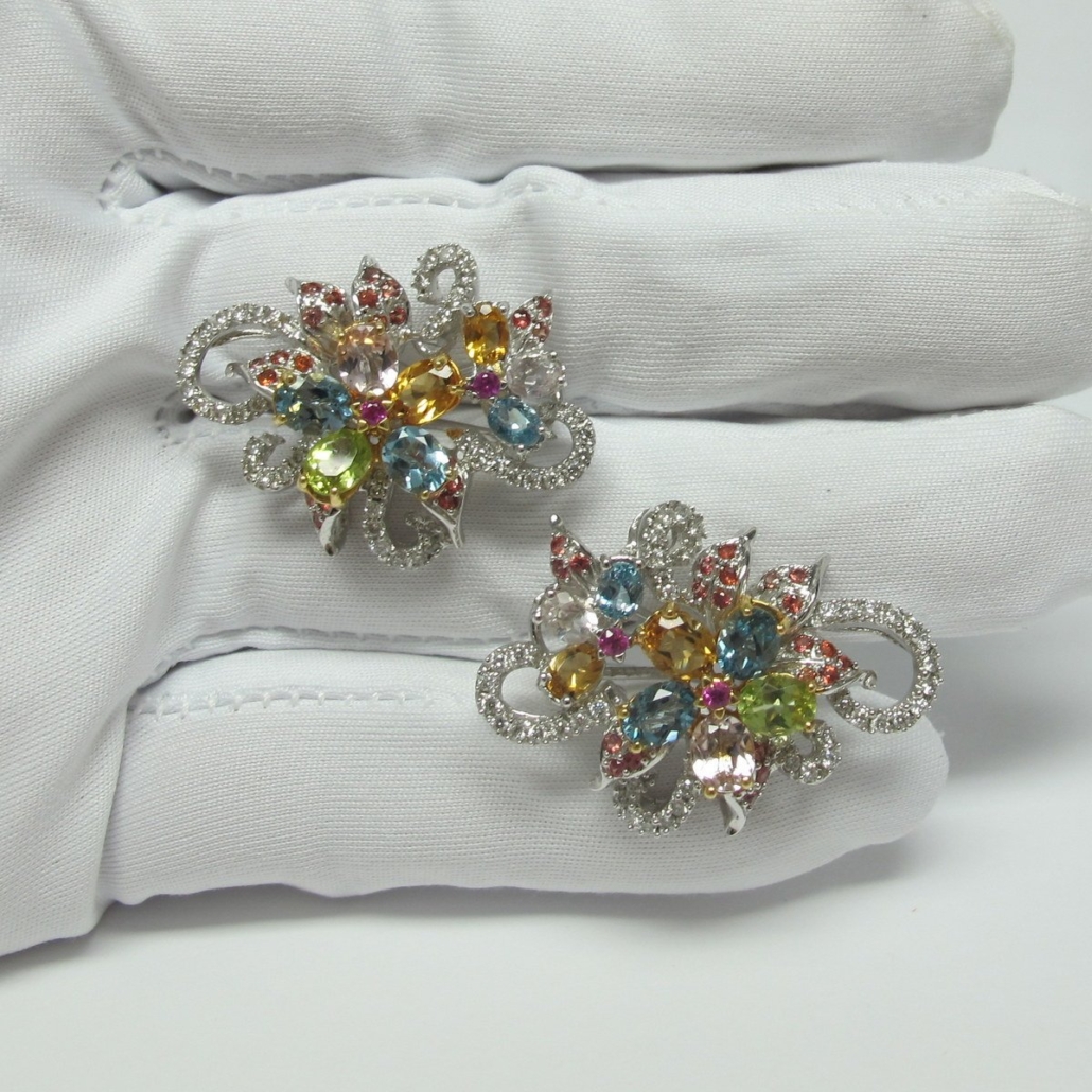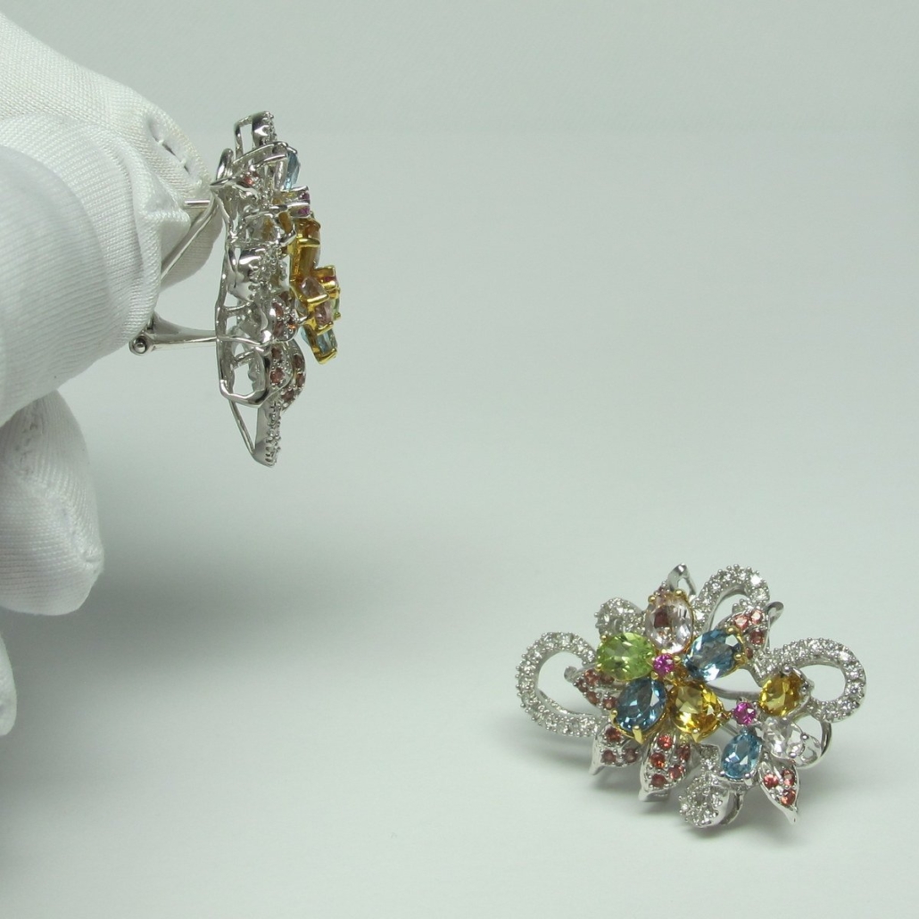 This floral earrings are made with 18k white gold and set with sapphires, garnets, topazes and diamonds. The stones are set in shared prongs.