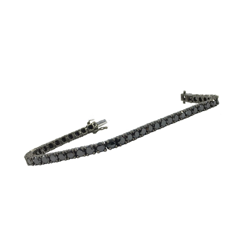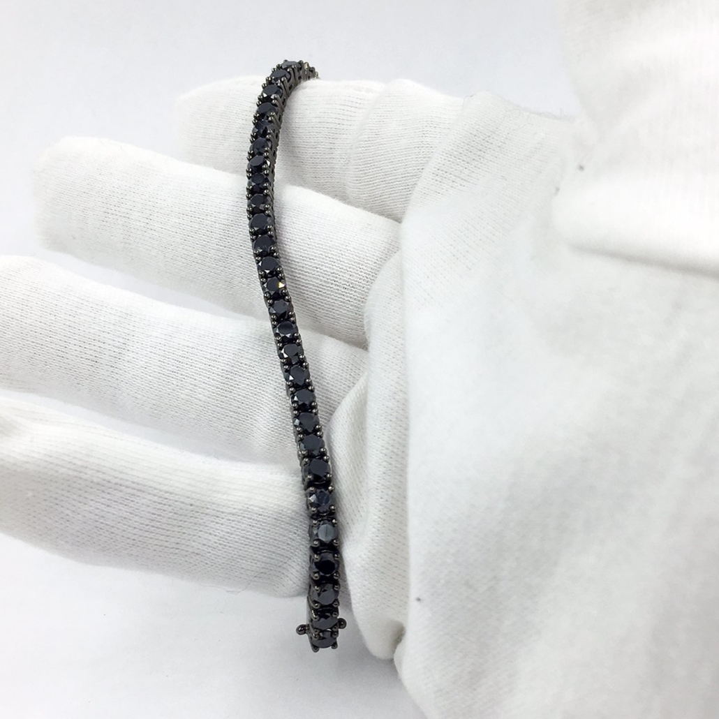 Black diamonds have a unique and dramatic beauty. This striking tennis bracelet was made with natural black diamonds in four prong settings.