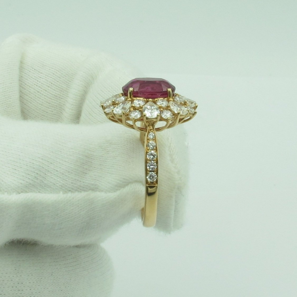 This ring is 18k rose gold and set with natural oval pink sapphire, surrounded by diamonds.