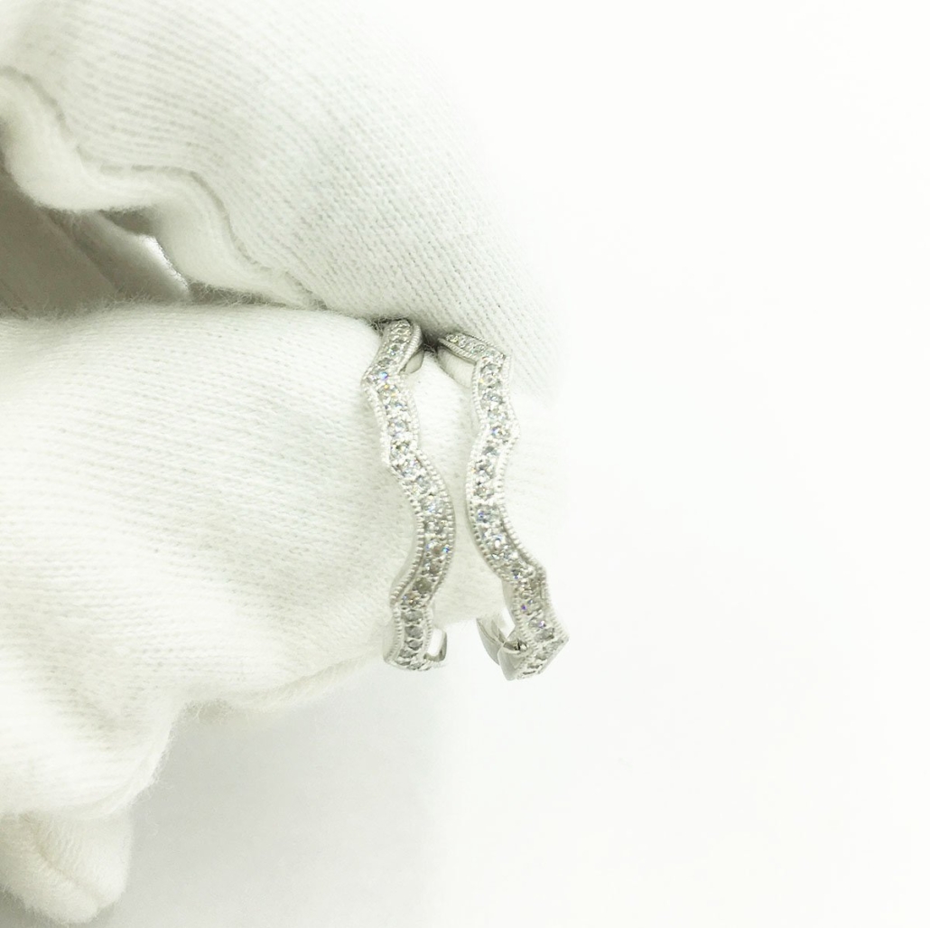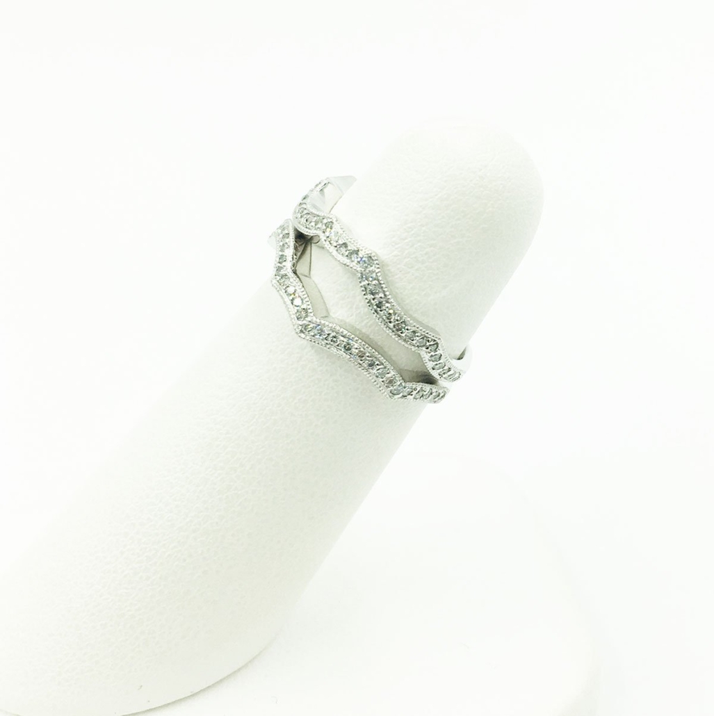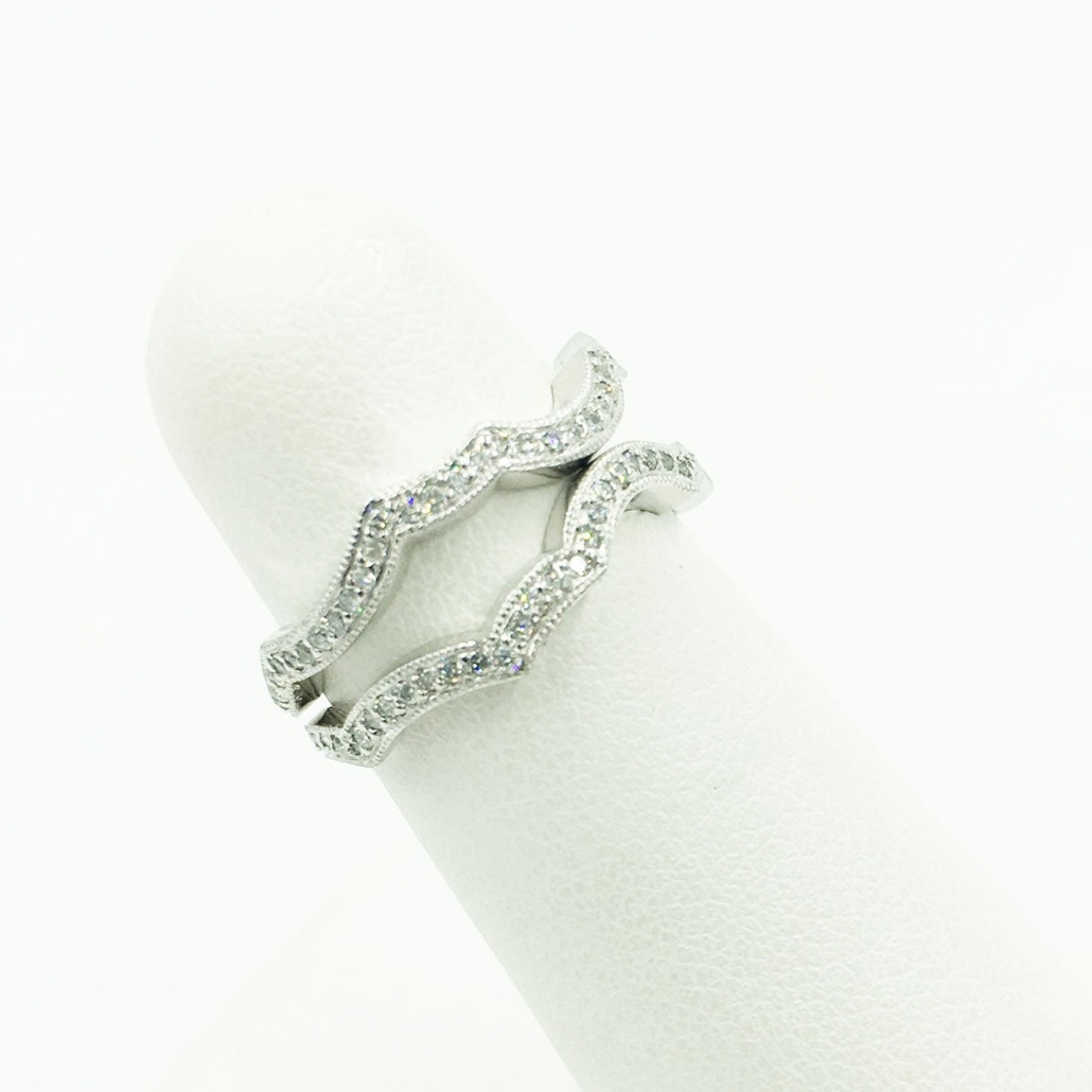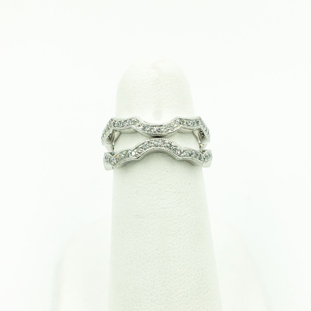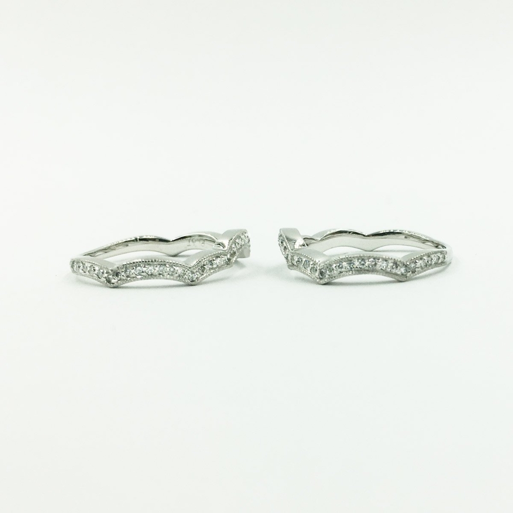 These platinum wedding bands were custom-made to fit around the bride’s engagement ring. The bands feature a scalloped design to match the engagement ring, and have milgrain details. Natural round brilliant diamonds are prong set all the way around.