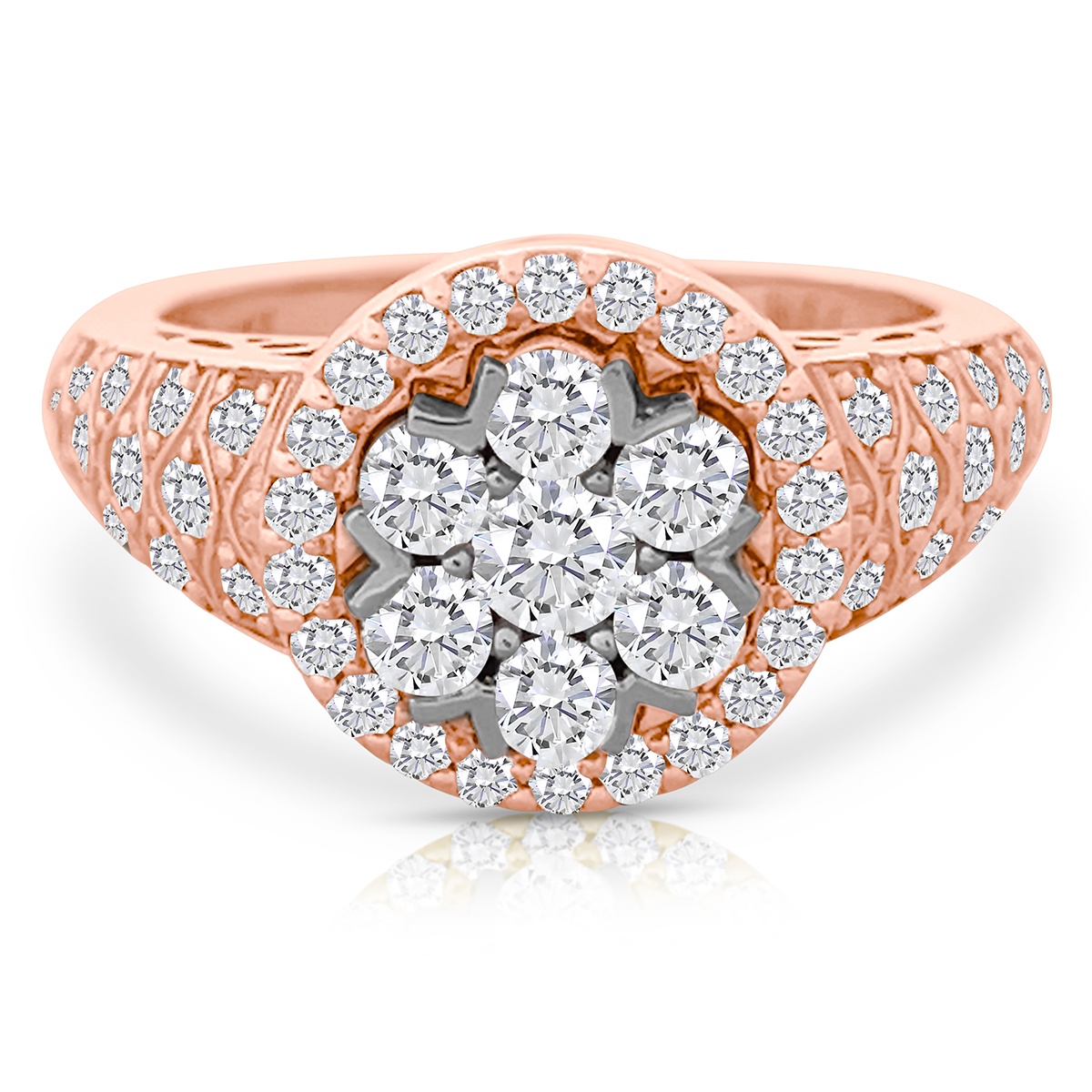 This cocktail ring is made with 14k pink gold and natural round brilliant diamonds. Center of the ring is a cluster of diamonds set within a diameter of the ring top and surrounded by a halo of smaller diamonds. The ring shoulders are also adorned with custom prong set diamonds. The ring has a beautiful airline gallery. The diamonds on this ring are custom prong set.