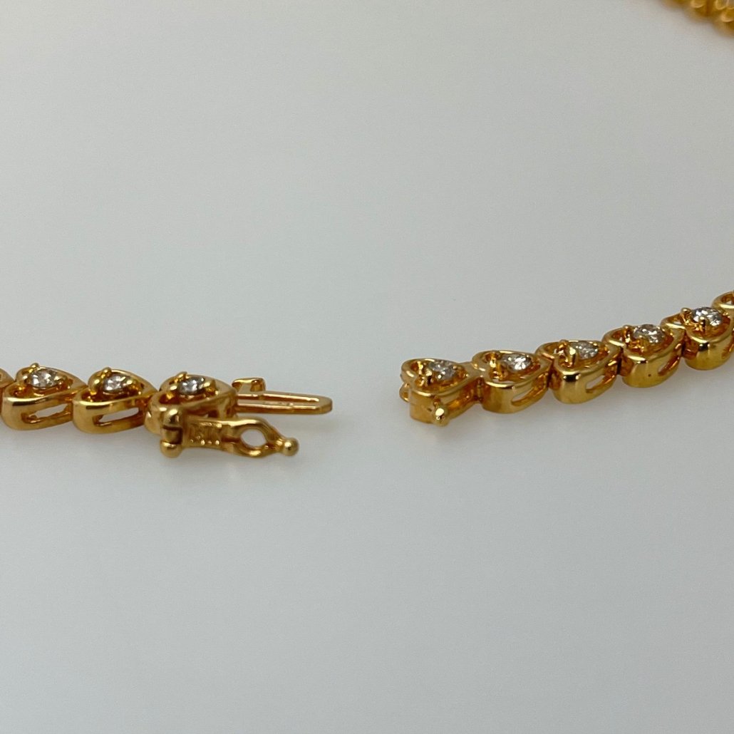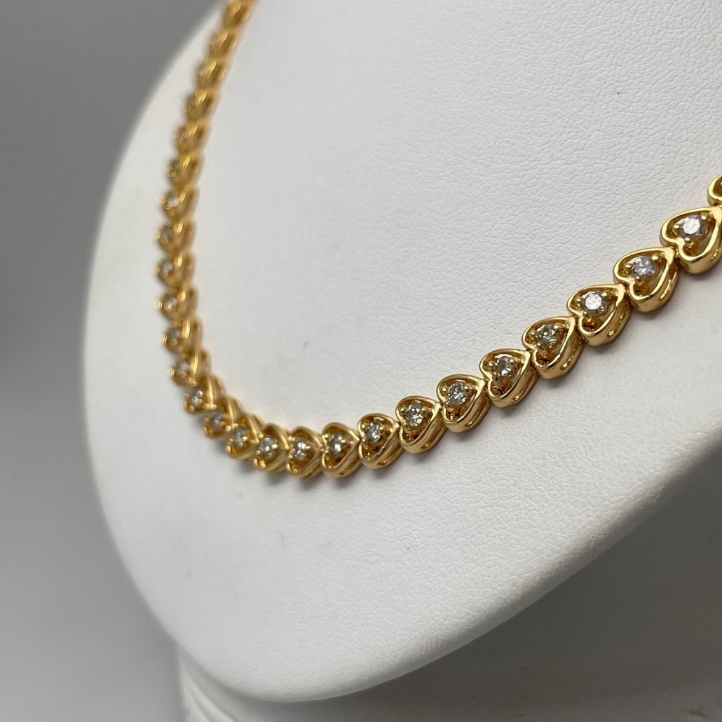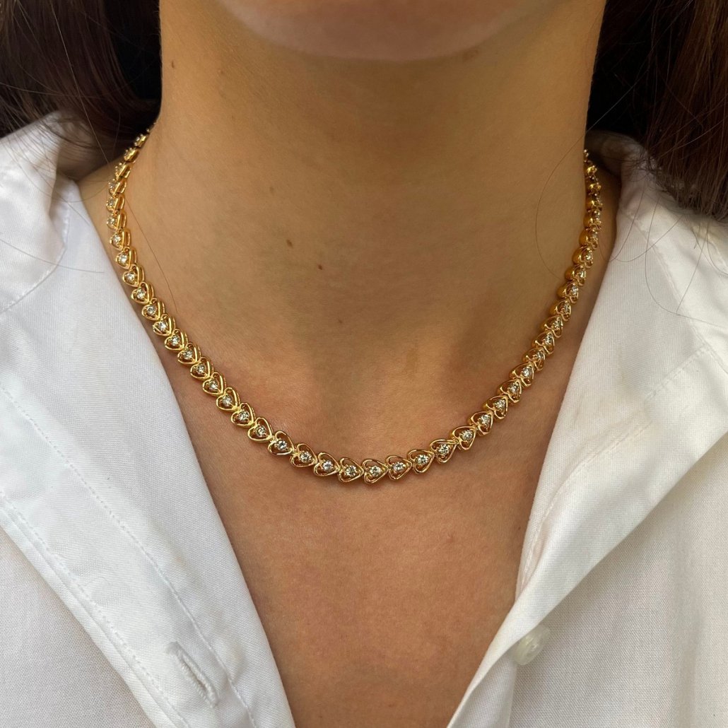 Seventy fluid open heart shaped links joined end to end, with a natural round brilliant diamond in the center of each heart.
