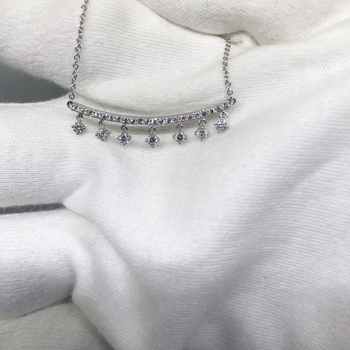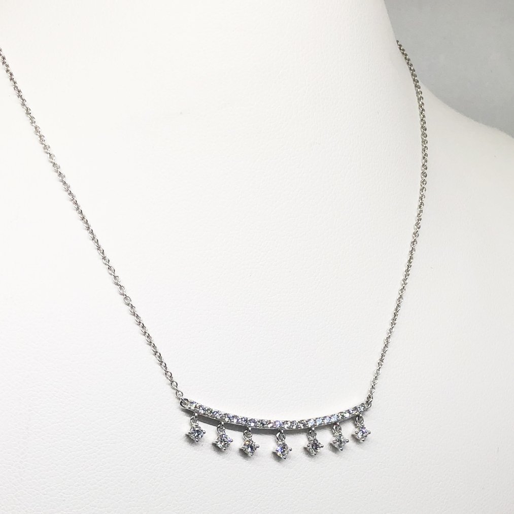 14K White Gold and Diamond Curved Bar Necklace with Dangling Diamonds