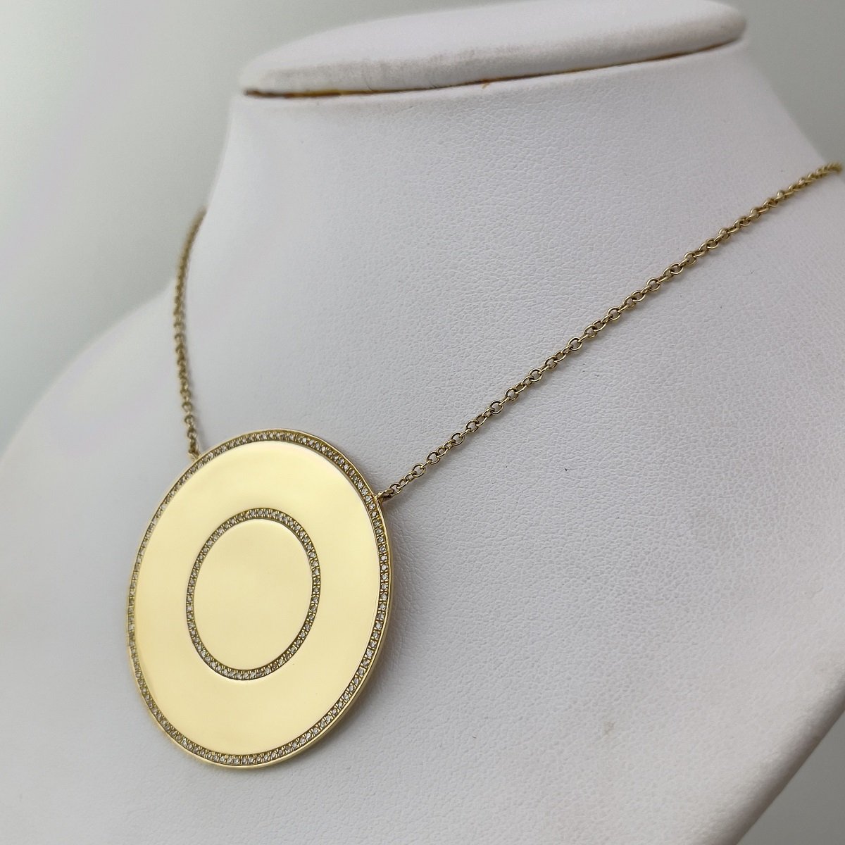 An irresistibly elegant simple design, a disc pendant with two concentric circles of prong set diamonds suspended on an 18″ cable chain of 14k yellow gold.