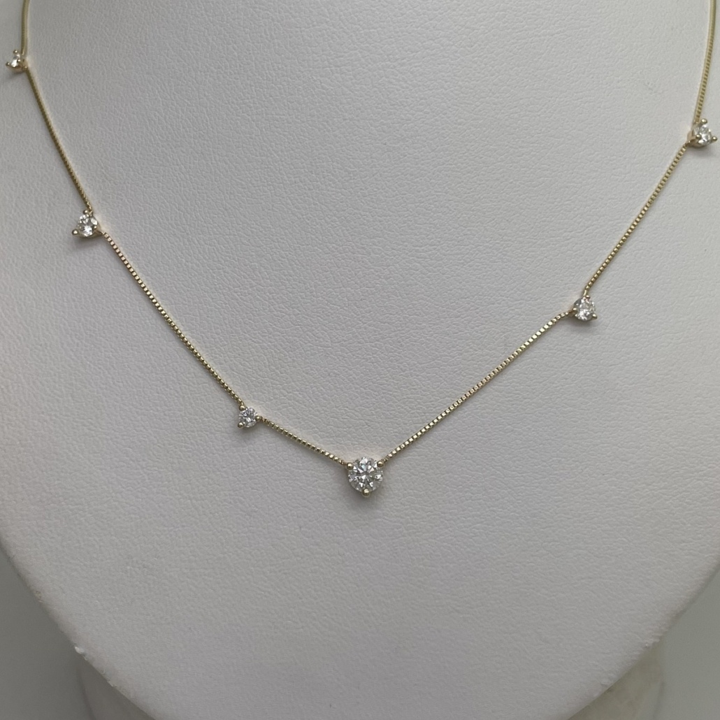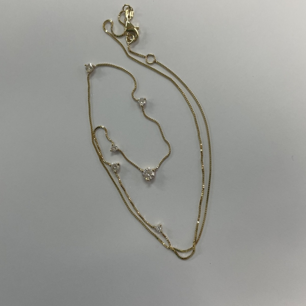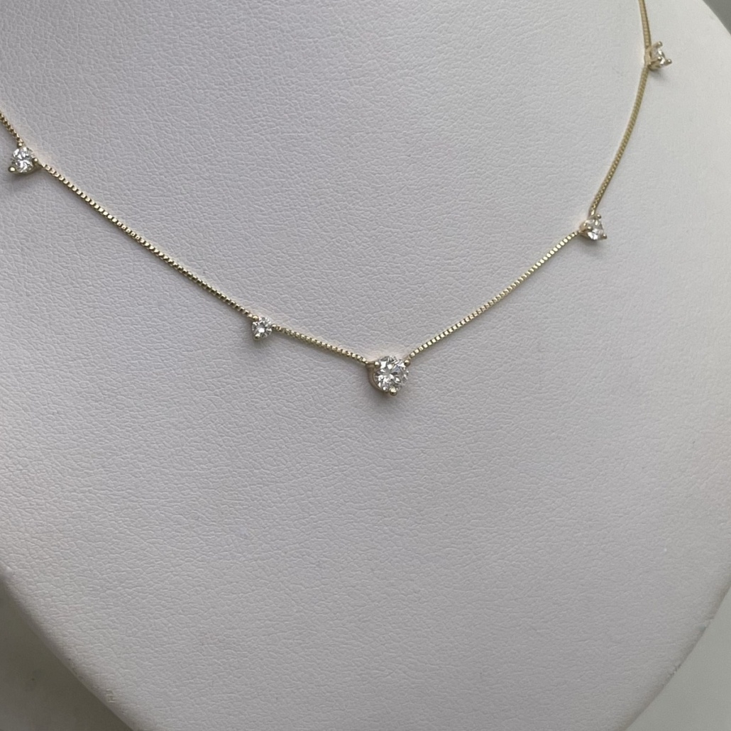 This necklace is made with 14k yellow gold and prong set with natural round brilliant diamonds.