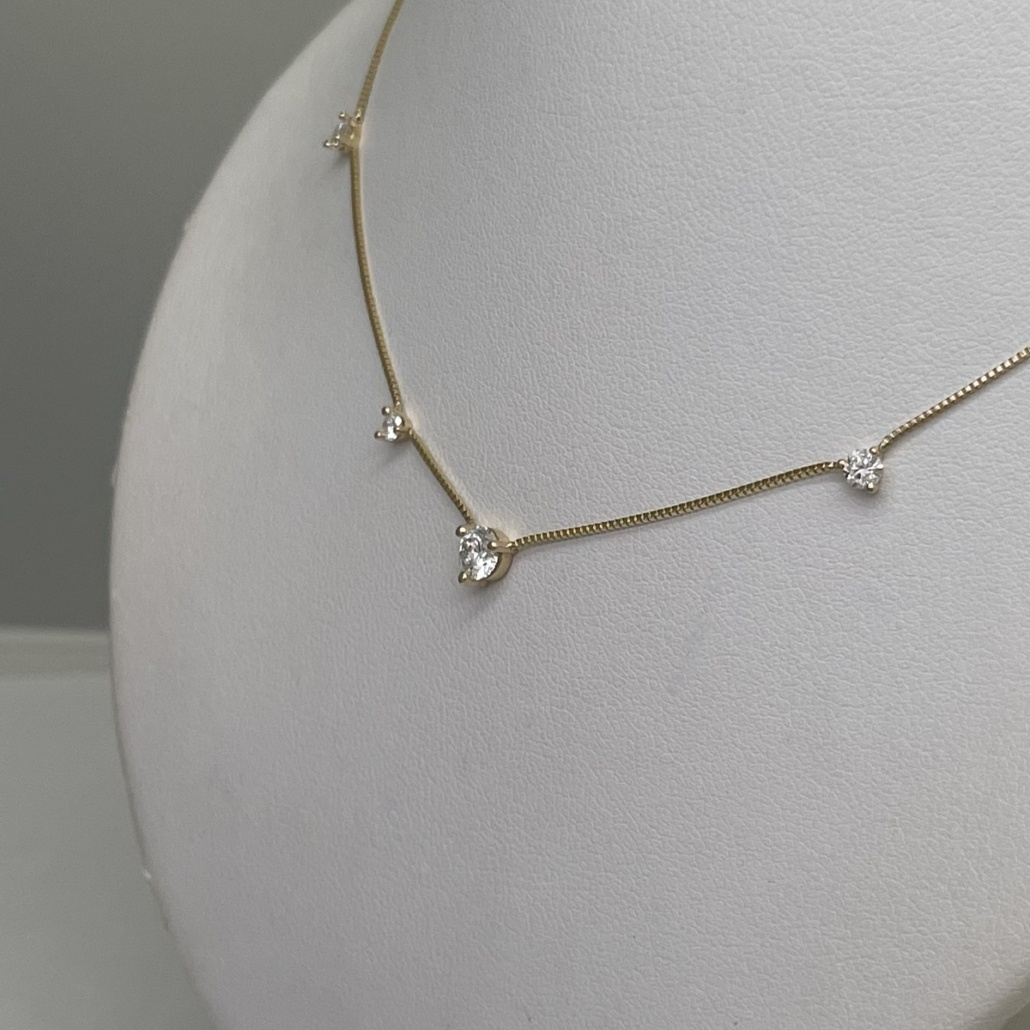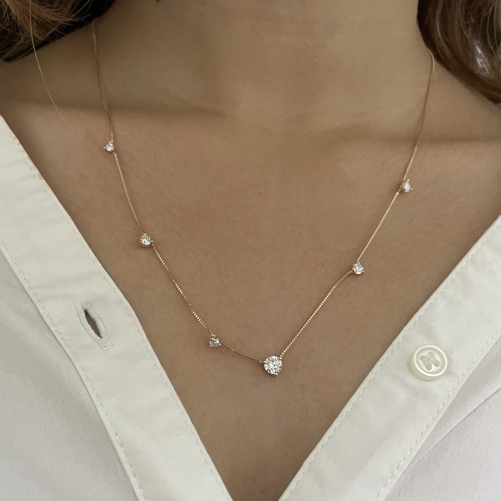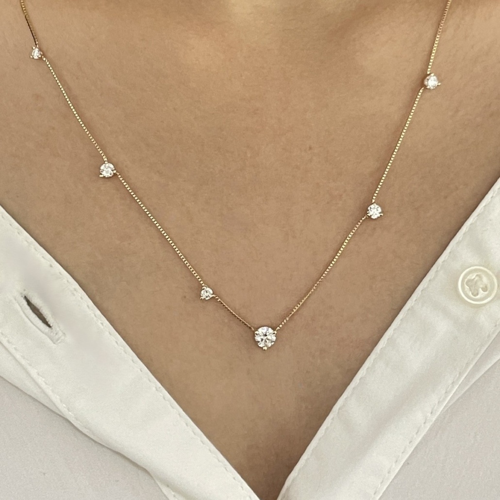 This necklace is made with 14k yellow gold and prong set with natural round brilliant diamonds.