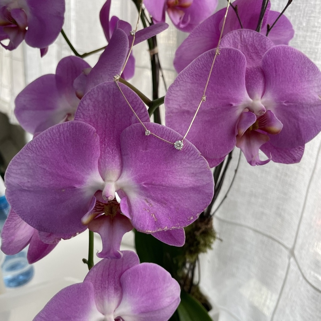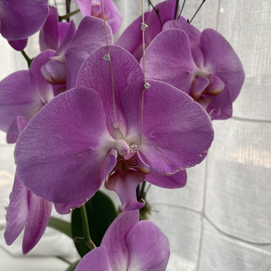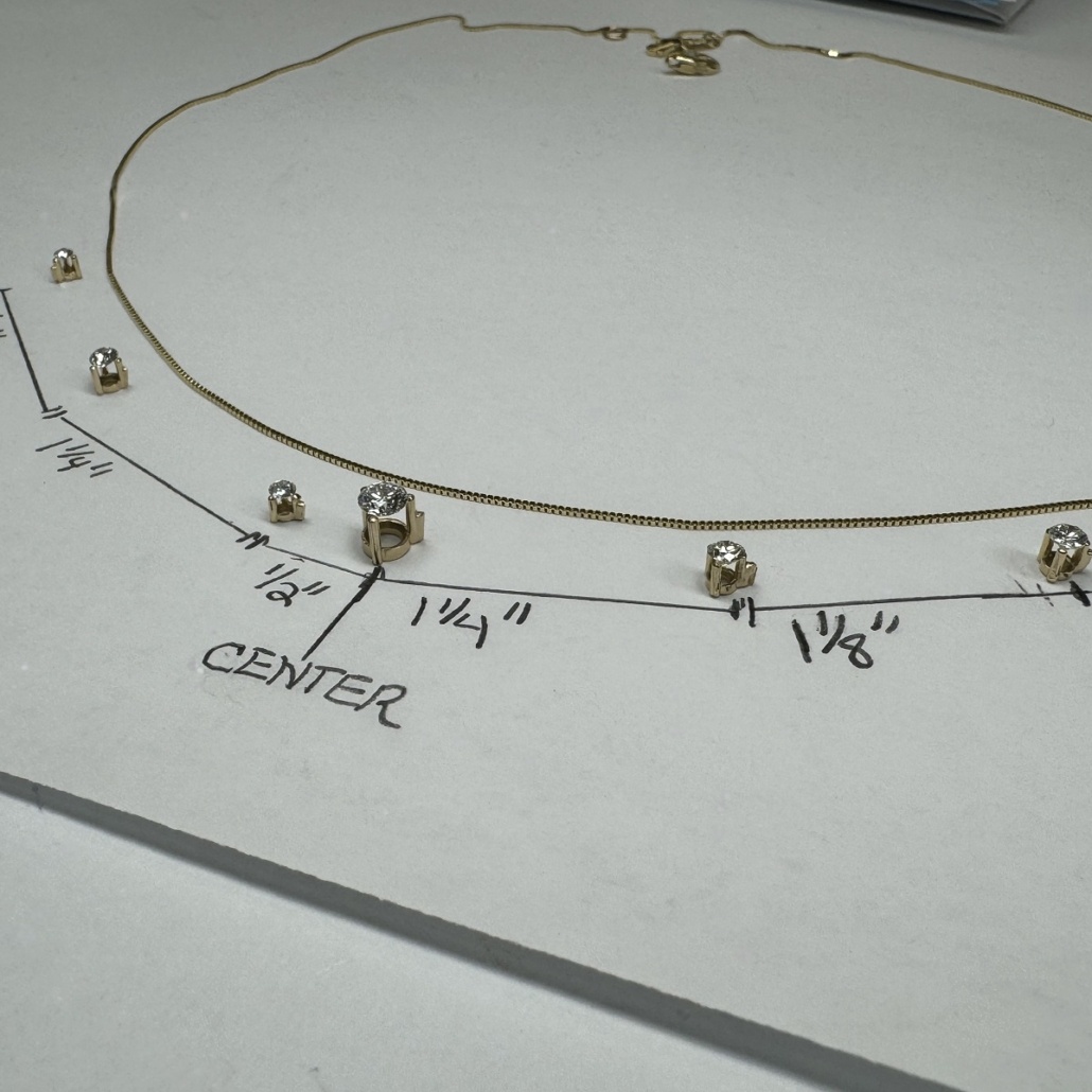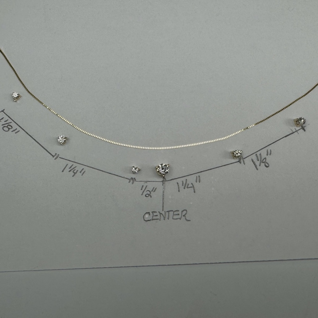 Each diamond is offset asymmetrically with three prongs on a sleek box chain. A unique arrangement that has both brilliance and charm. A distinctive touch of elegance.