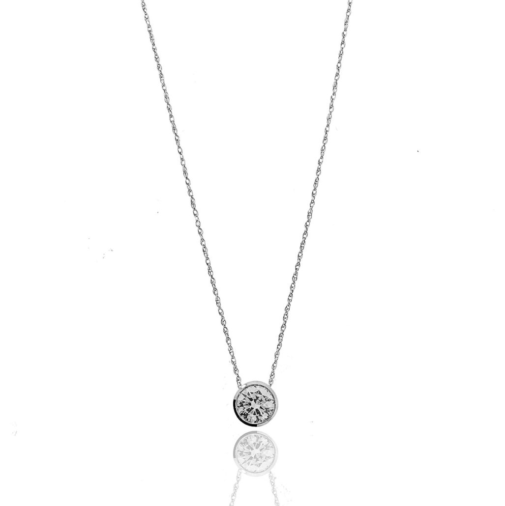 This solitaire diamond pendant necklace is made of 14k white gold. The pendant is holding a natural round brilliant diamond that weighs 0.72 carats.  The diamond is graded H in color and SI2 in clarity.  The diamond is bezel set in the pendant and hanging from an eighteen inch rope chain. The bail is hidden in the back and the pendant slides. The chain is secured with a spring ring.