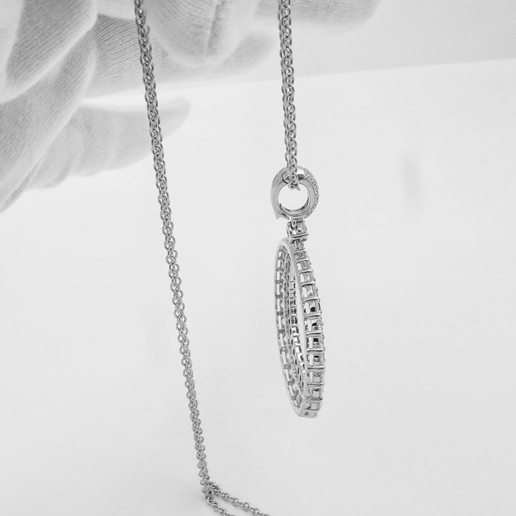 This pendant features 54 natural round brilliant diamonds and 45 treated black diamonds set in a graduated open circle. The diamonds are arranged in concentric circles, with the black inside and colorless outside. The bail features 22 diamonds, graduated in size.