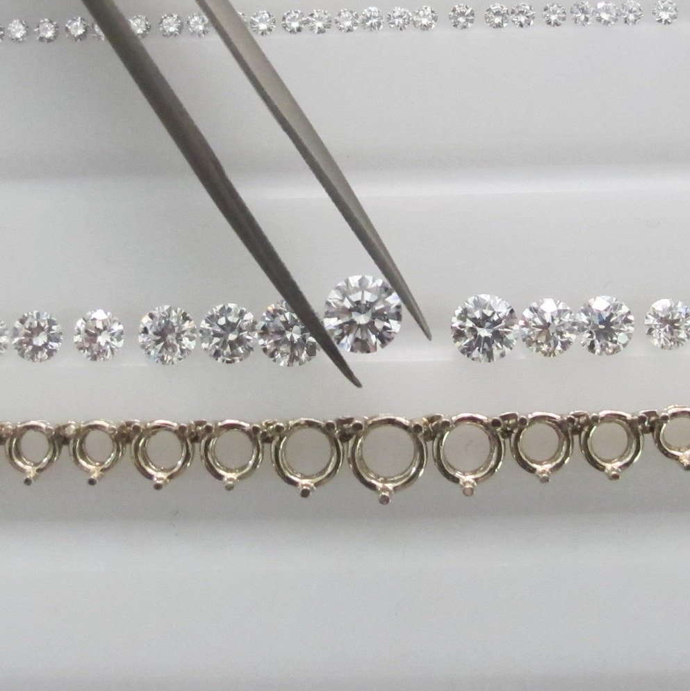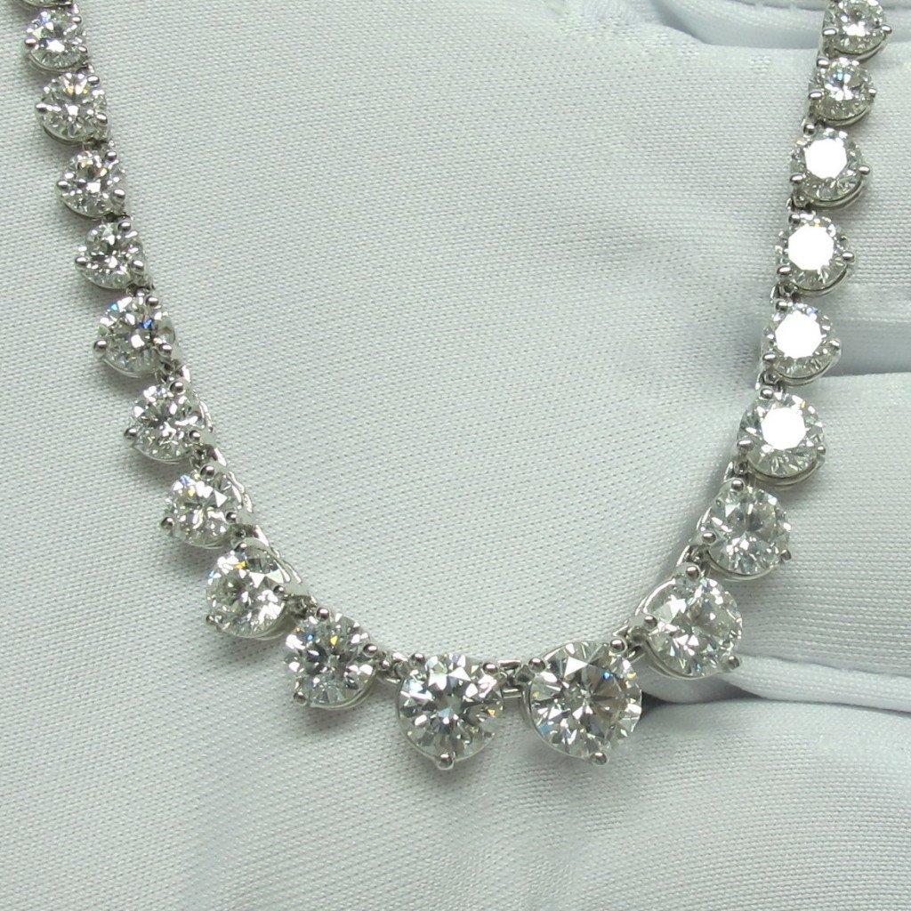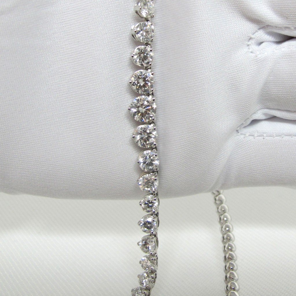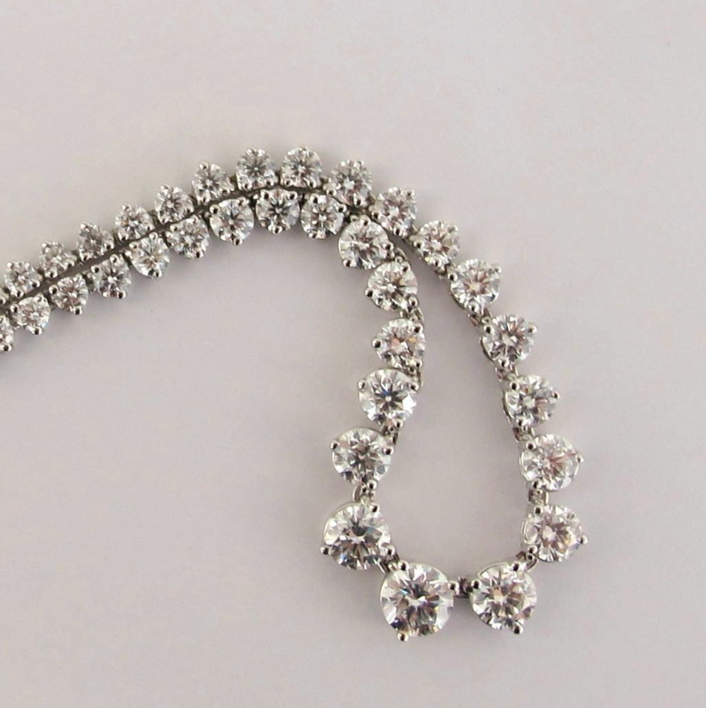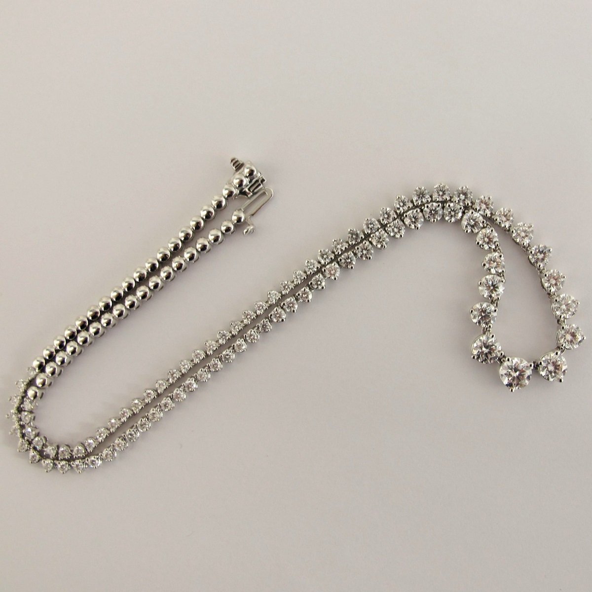 The necklace is plumb 18k white gold and weighs 22 grams. There are seventy five natural round brilliant diamonds that total 9.08carats. They graduate from 0.71carats as the largest to .035 as the smallest. The diamonds are GIA graded color FG and clarity VS2-SI1.