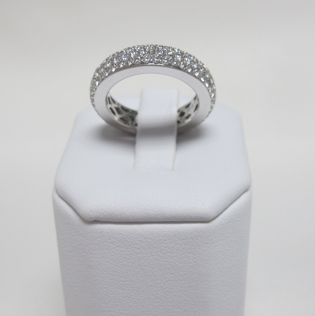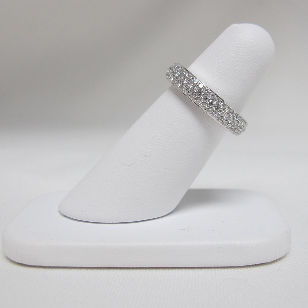 18K white gold diamond eternity ring with stones pave set in three rows. The ring has a high polish on the top and bottom as well as on the inside. This is a handmade eternity ring.