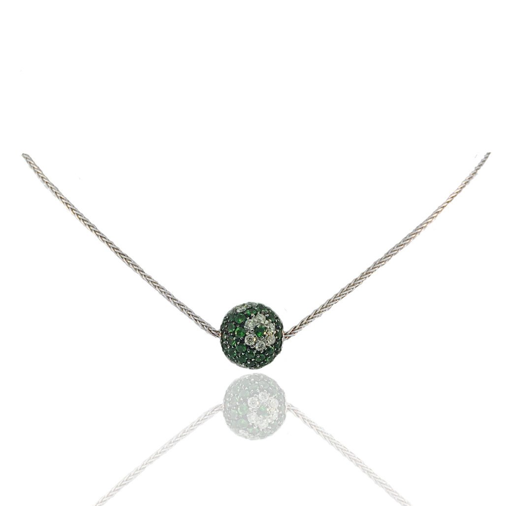 This 18k white gold pendant is an 8.5mm round ball encrusted with emeralds and diamonds. The emeralds act as a lush background for sparkling diamond flowers. The emeralds total 1 carat, and are AAA quality. The diamonds total 0.48 carats, and are rated G in color and VS in clarity.