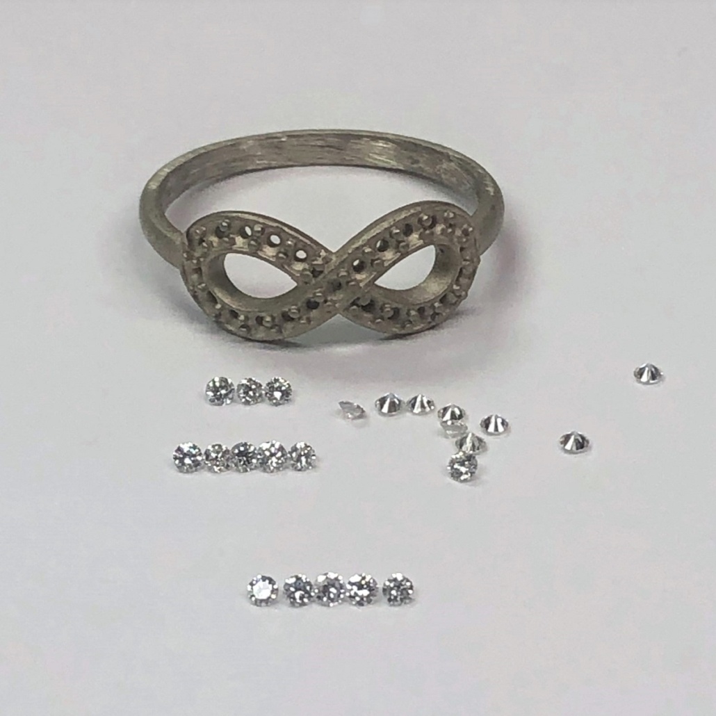 This 18k white gold custom made ring is designed to be an symbol infinity at the top. The stones are natural round brilliant diamonds that are four prong set onto the ring