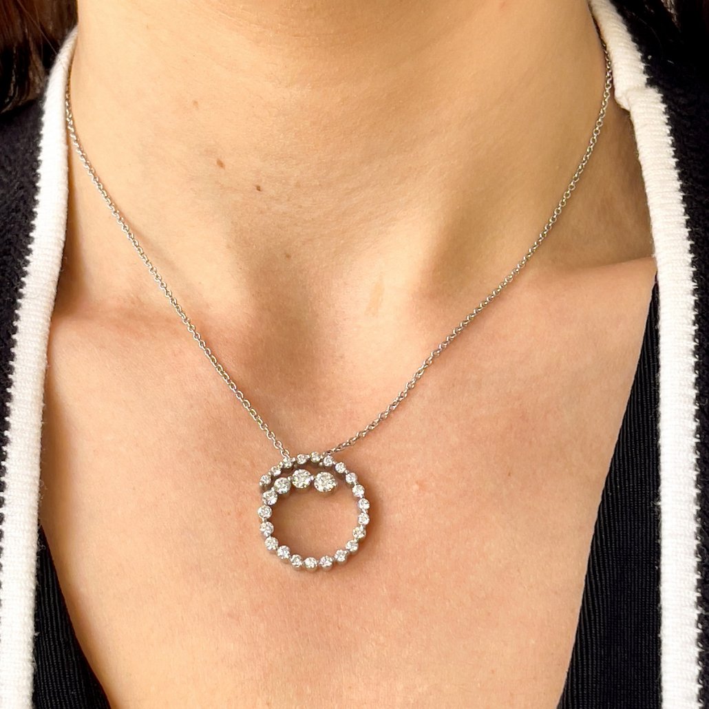 Sensational sparkle radiates from this chic and beautiful diamond circle pendant necklace.  Diamonds grow larger as the pendant spirals inward.
