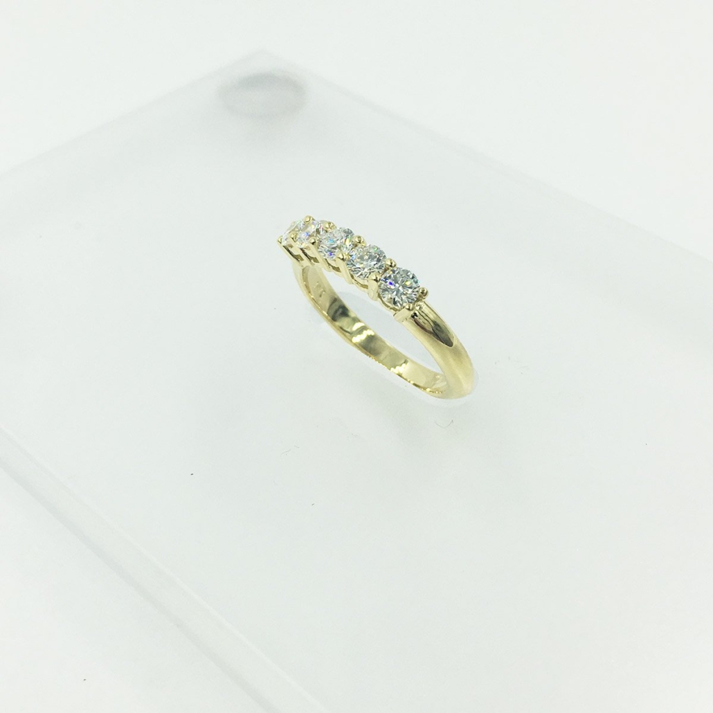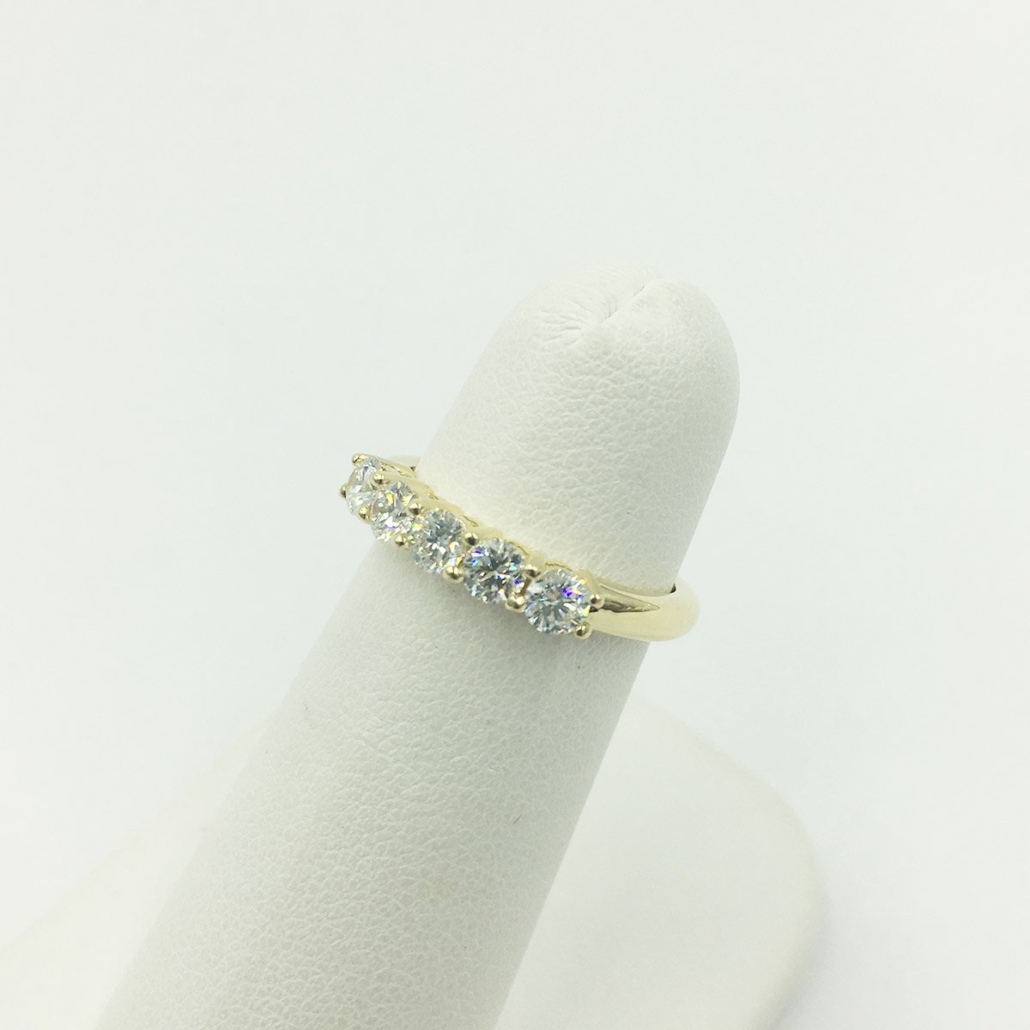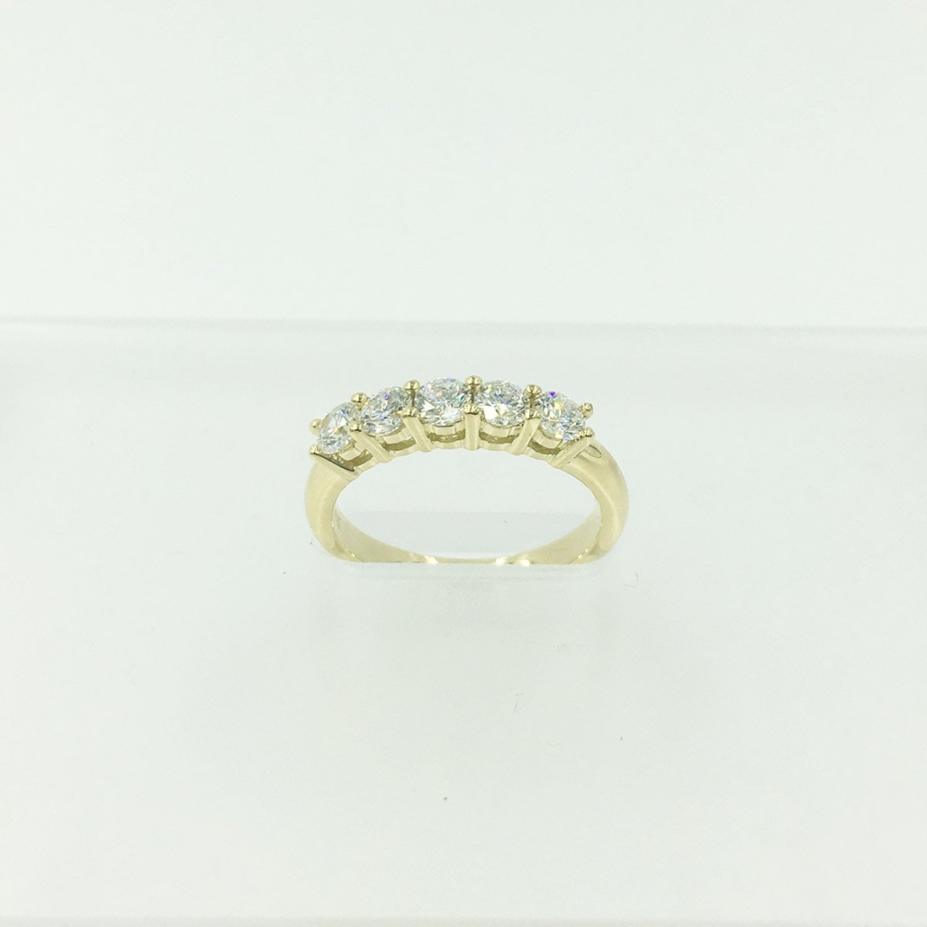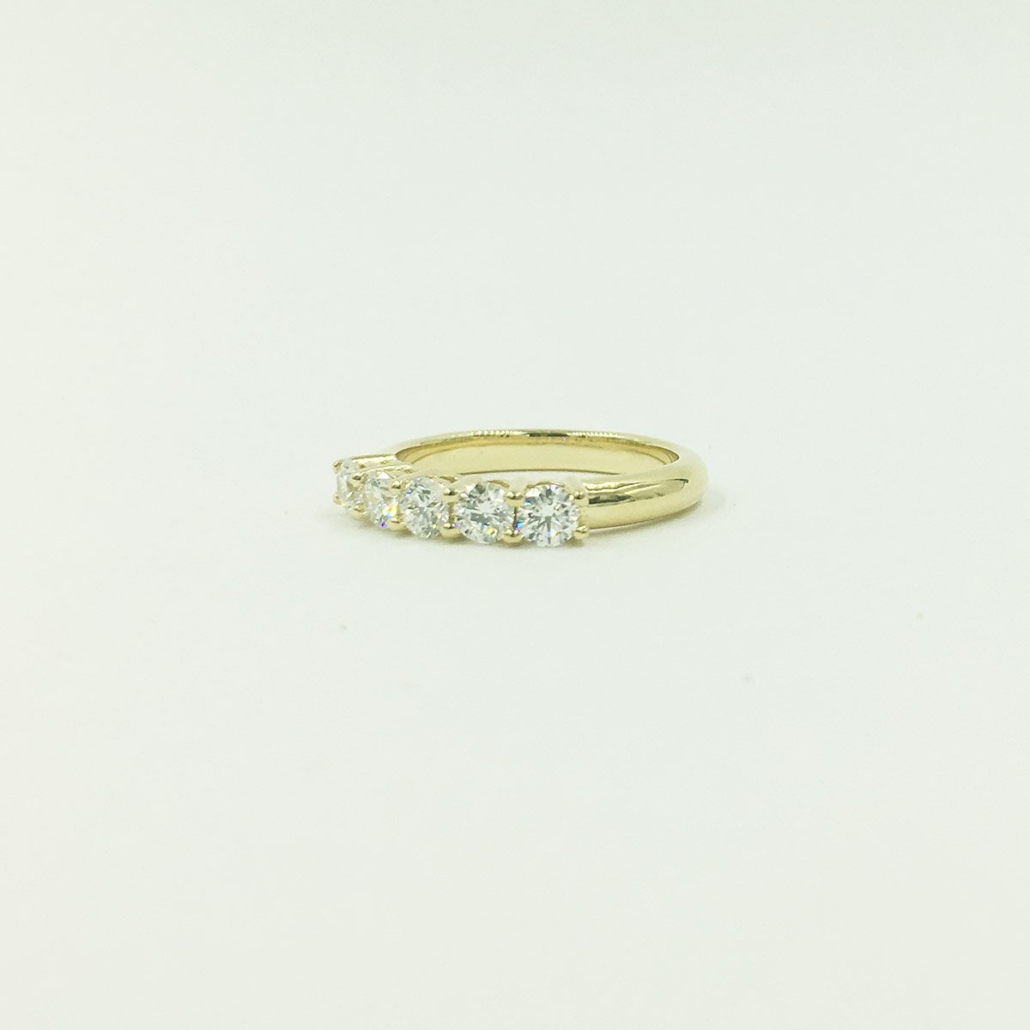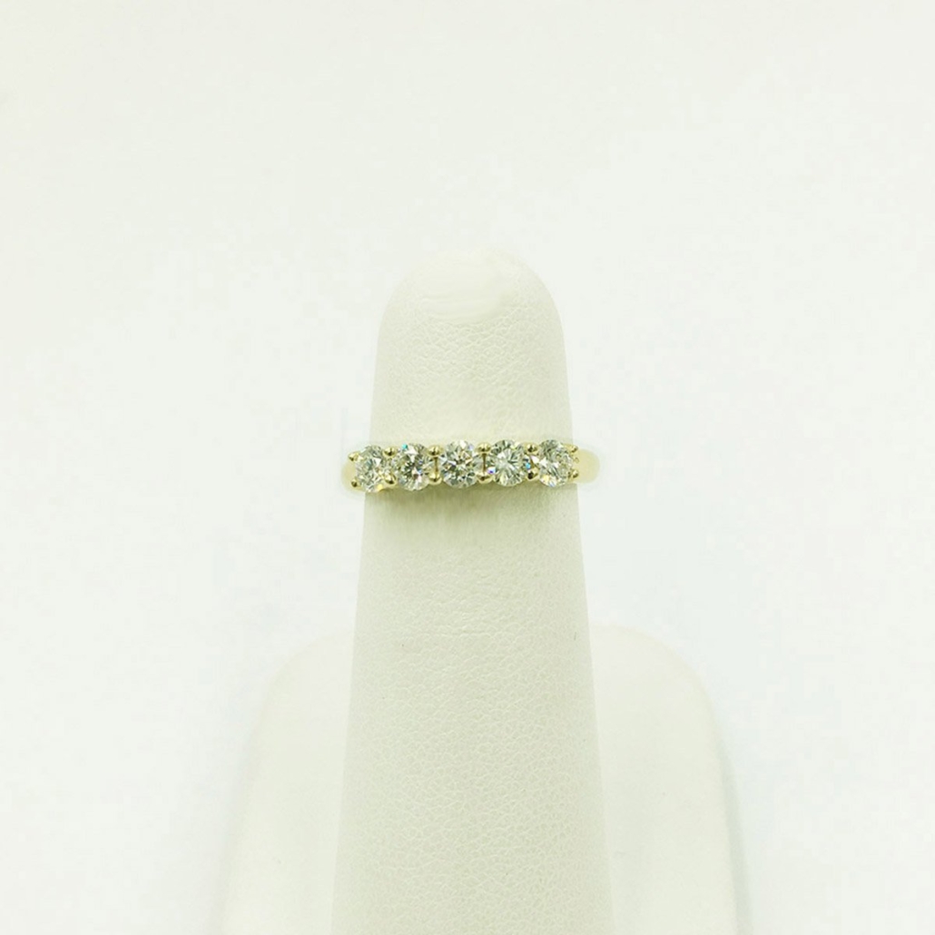 This 18K yellow gold Diamond Wedding Band contains five natural round brilliant diamonds.