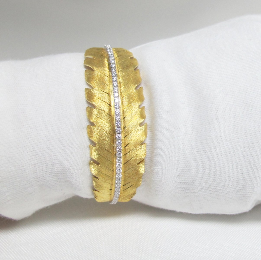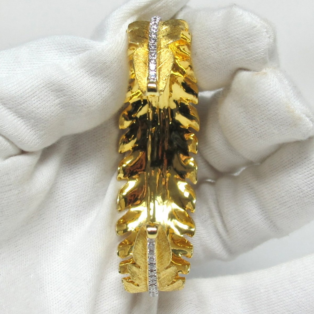 This 18 K Yellow Gold bangle bracelet features a retro leaf design with a center diamond band accent.