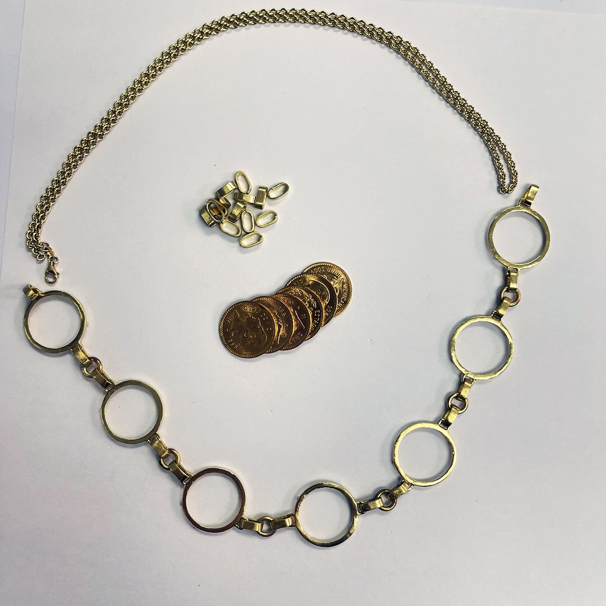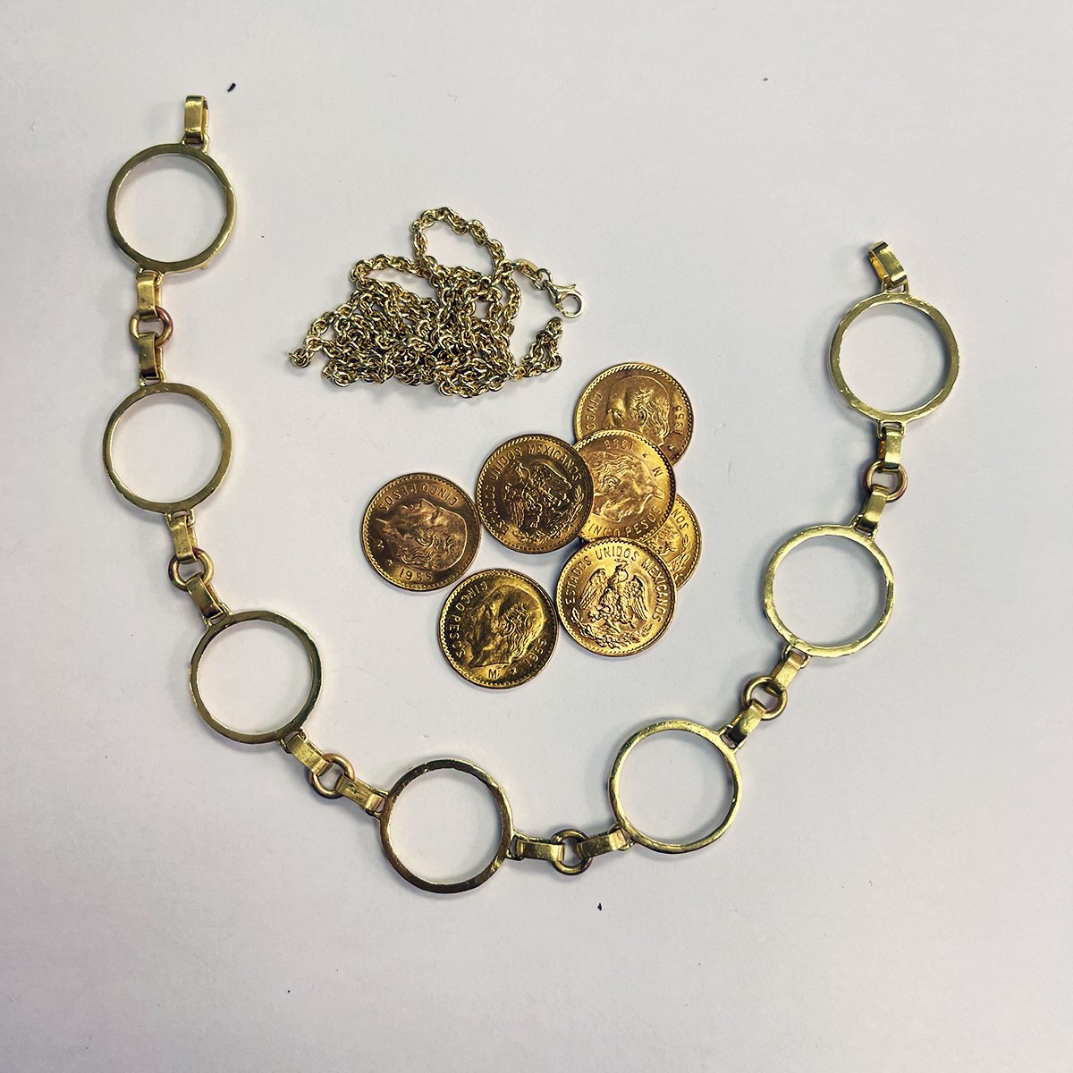 The necklace is custom made and a one-of-a-kind design. It contains seven gold Mexican Cinco Peso coins.