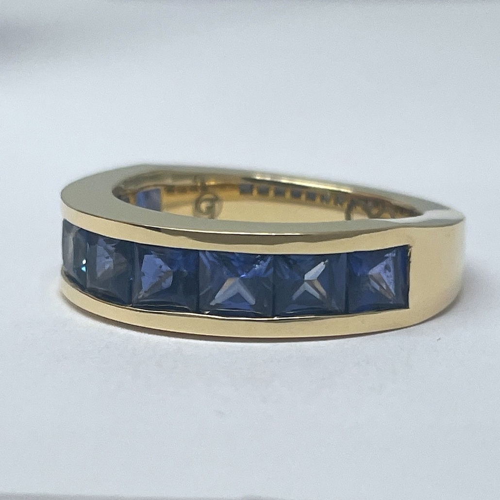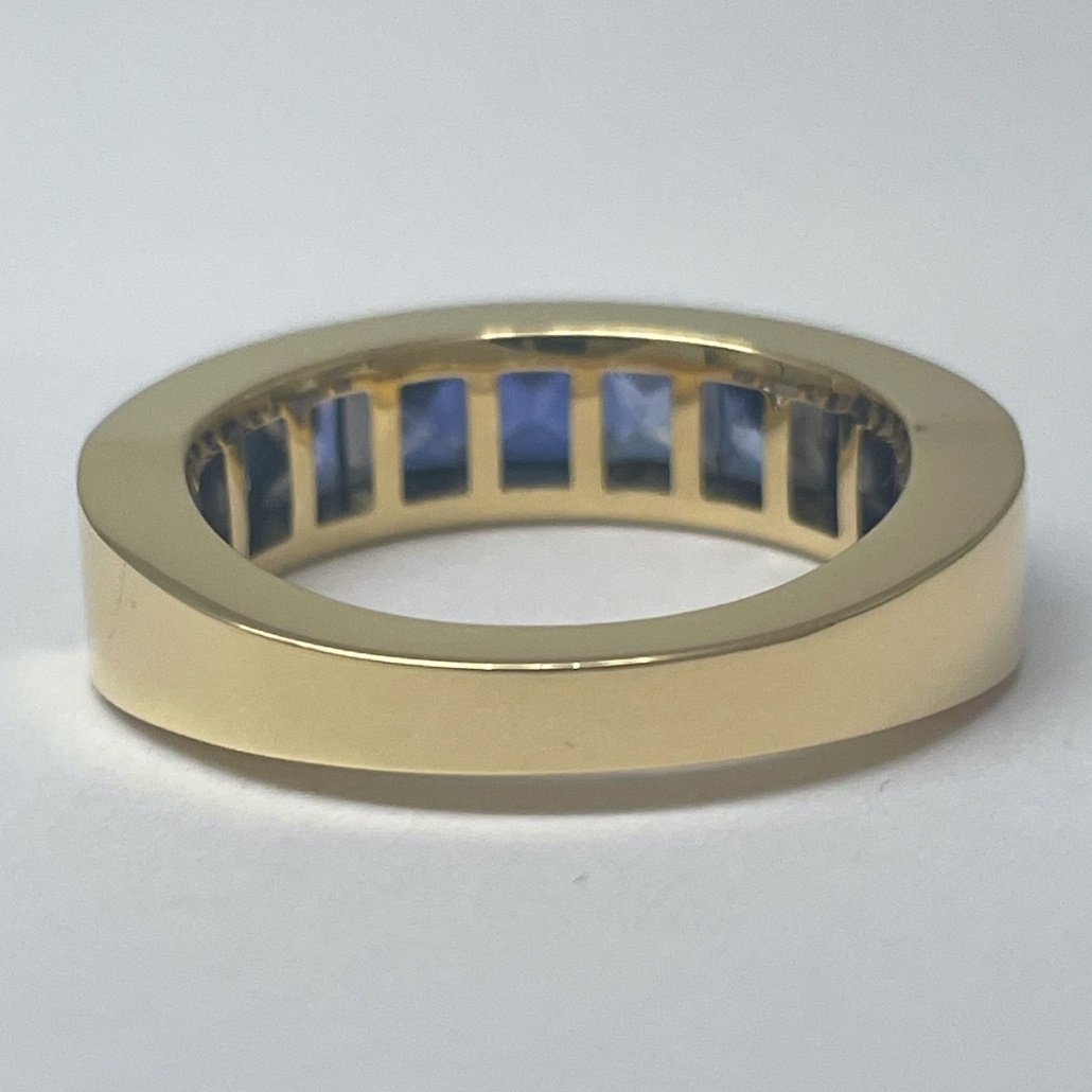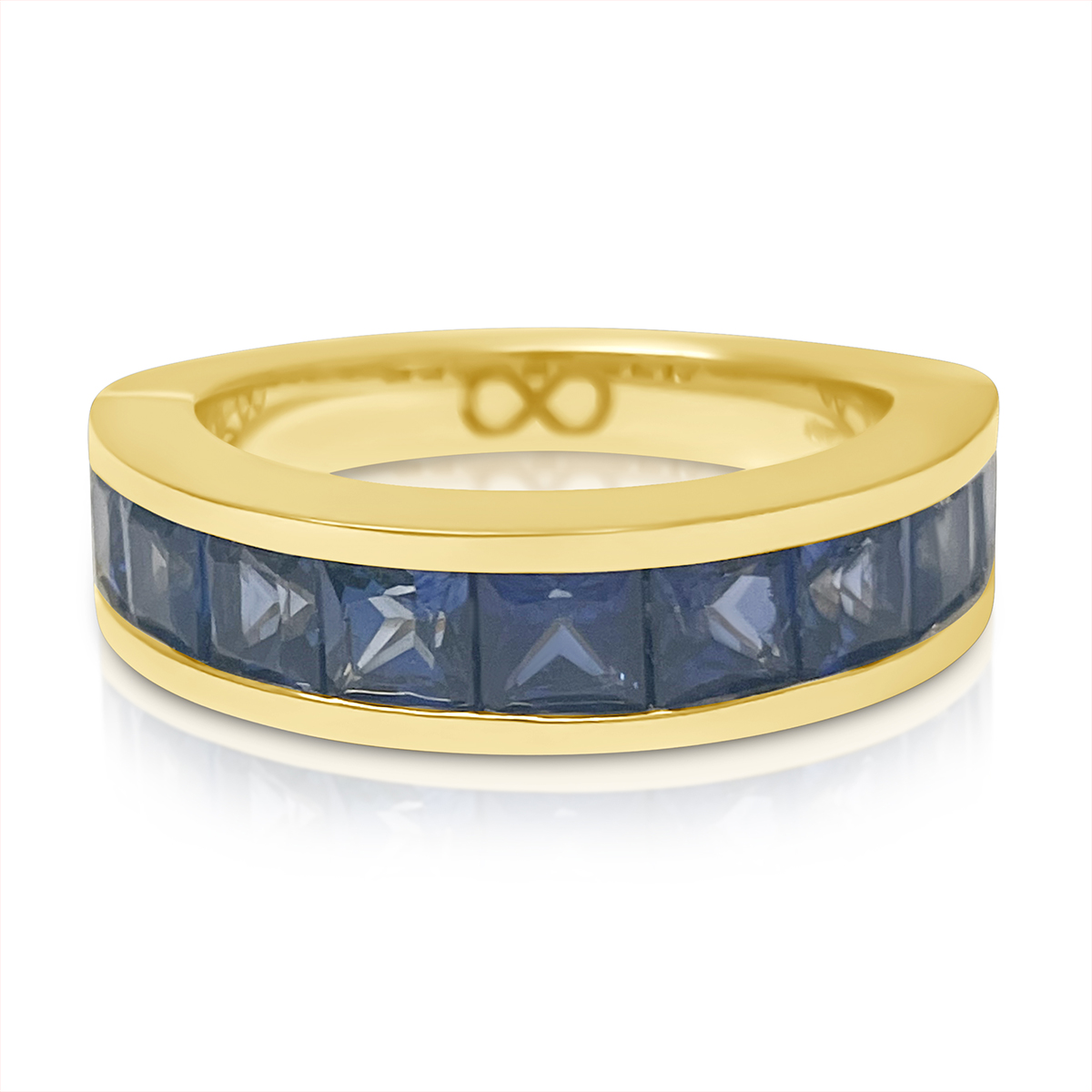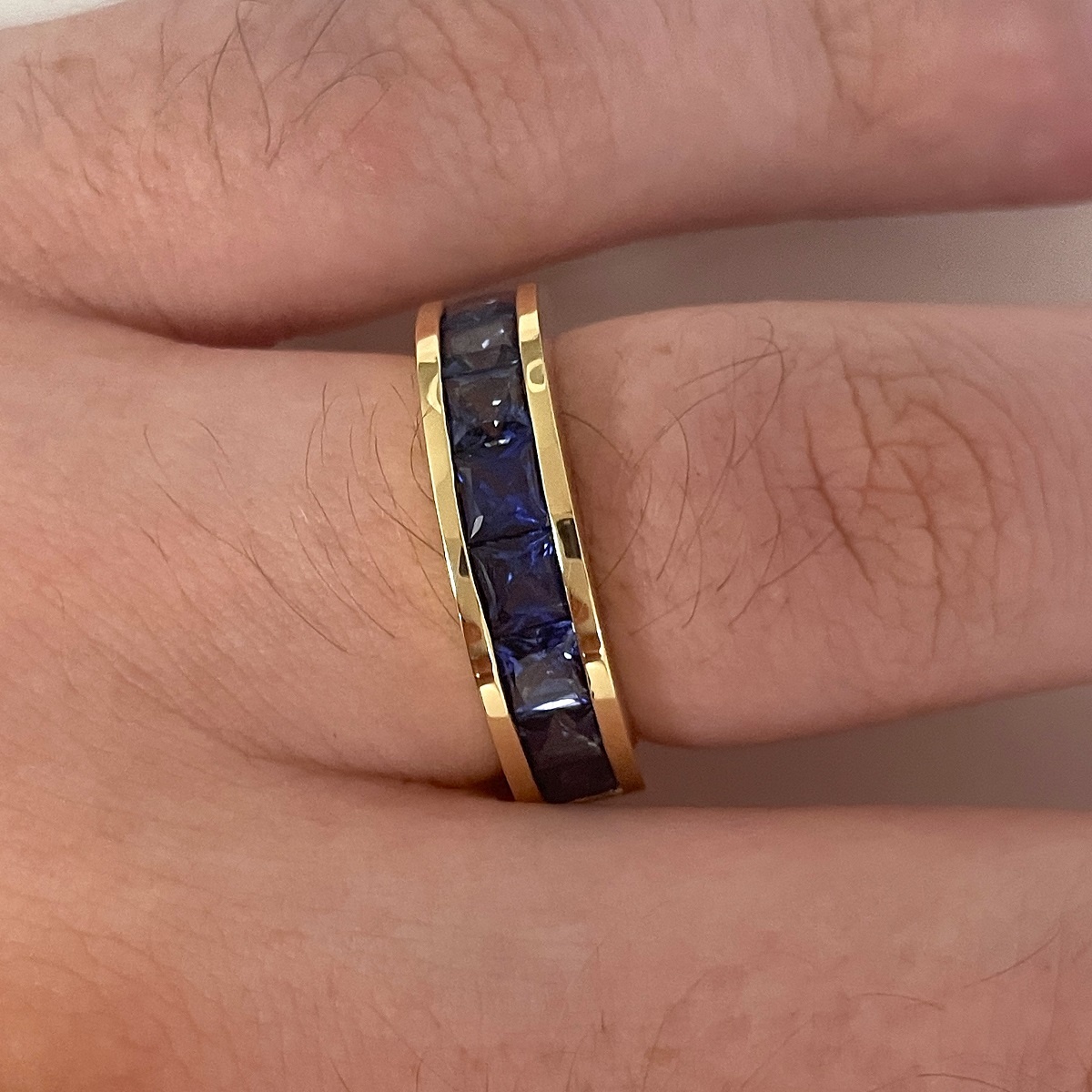 This gentlemen ring is made with 18k yellow gold and natural square cut sapphires, in channel set half away around the ring.