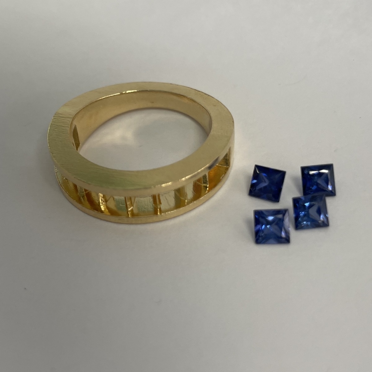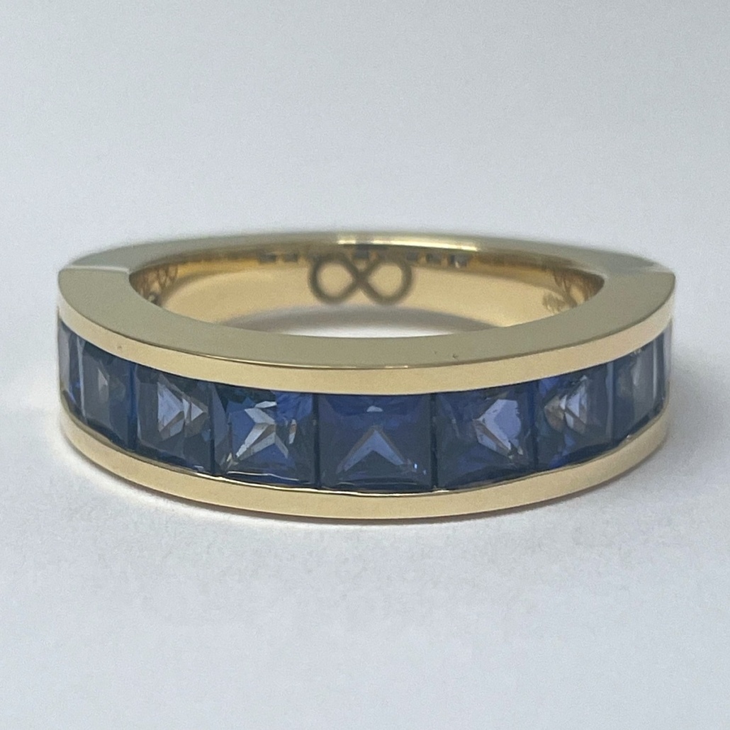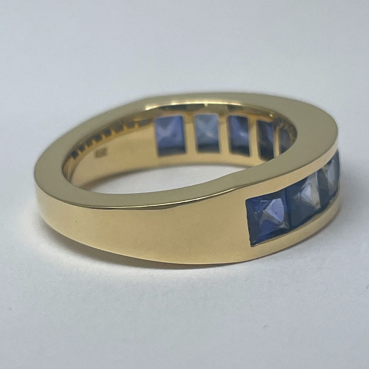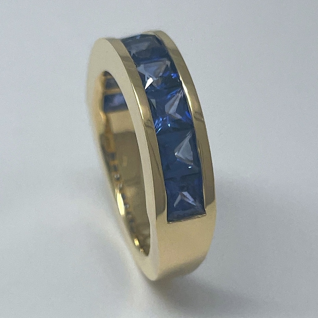 This gentlemen ring is made with 18k yellow gold and natural square cut sapphires, in channel set half away around the ring.