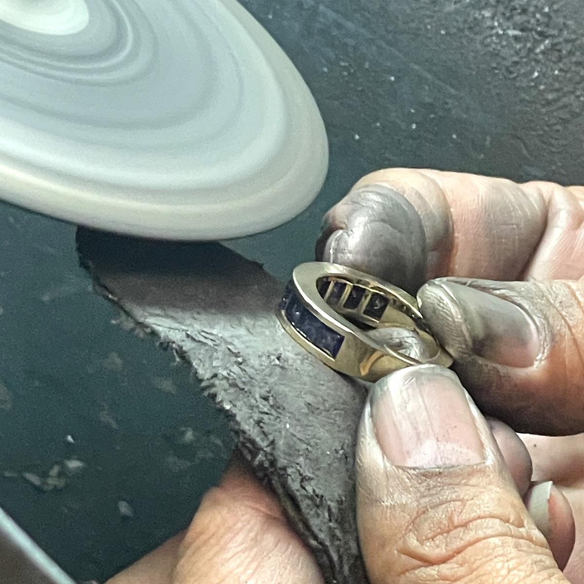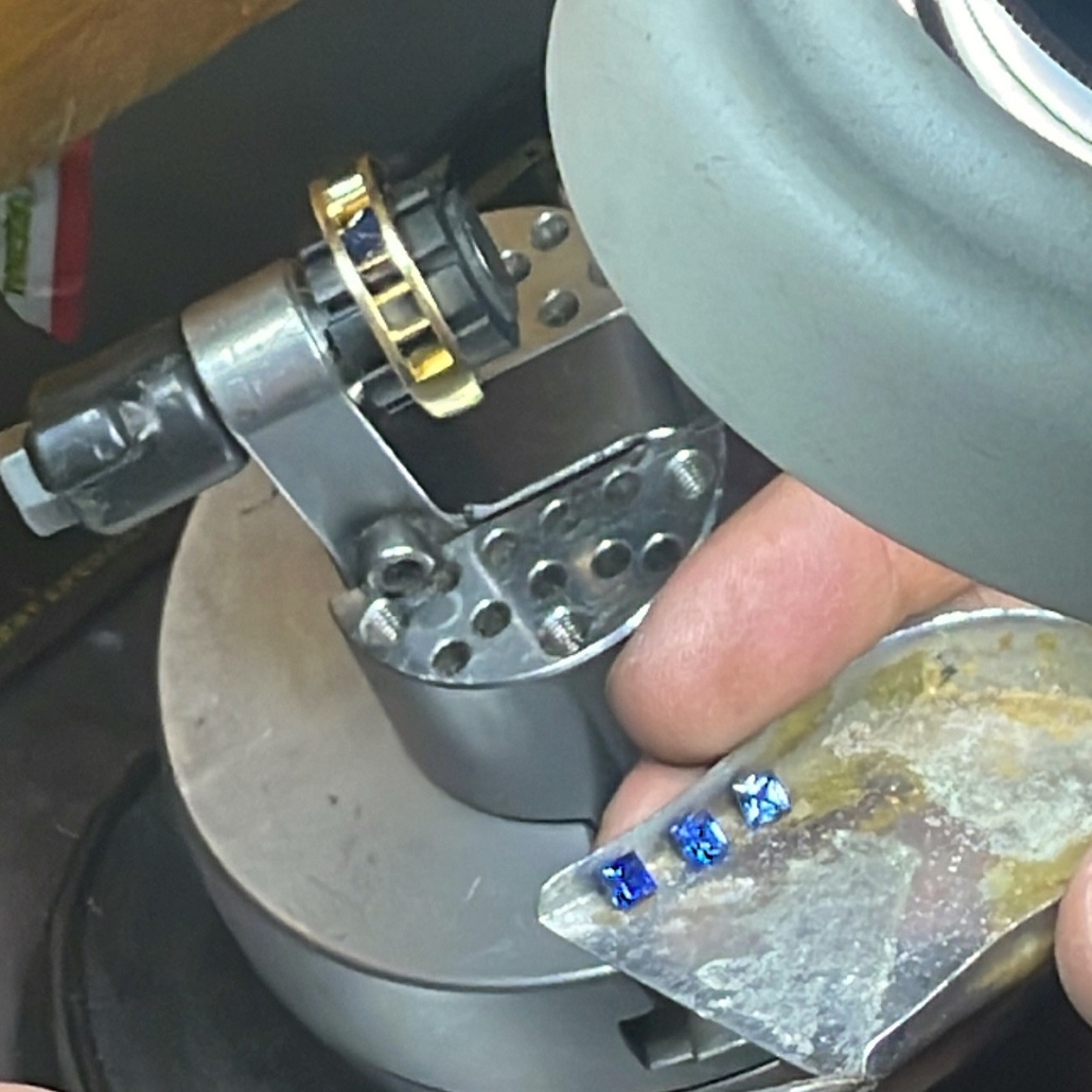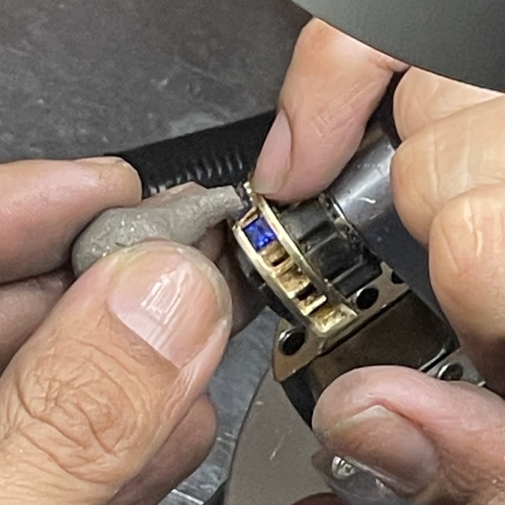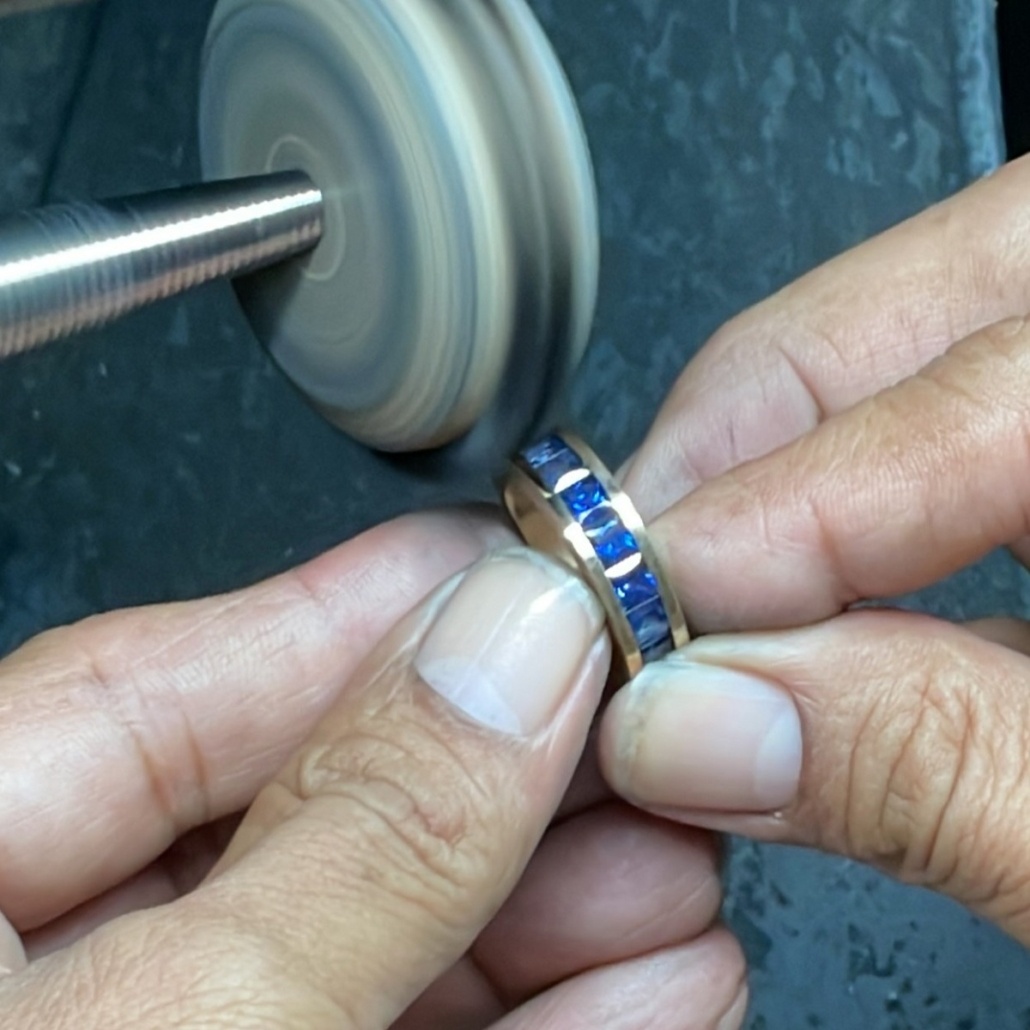 This gentlemen ring is made with 18k yellow gold and natural square cut sapphires, in channel set half away around the ring.