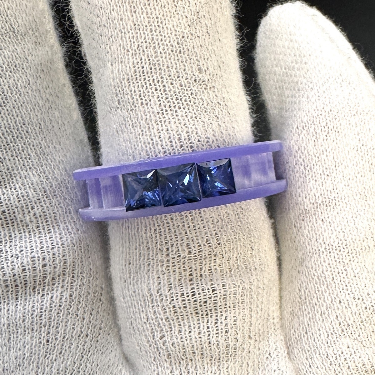 This bold ring features a deep blue sapphire set in a sleek, polished band. The sapphire’s rich hue contrasts elegantly against the smooth metal, creating a look that’s both modern and timeless.