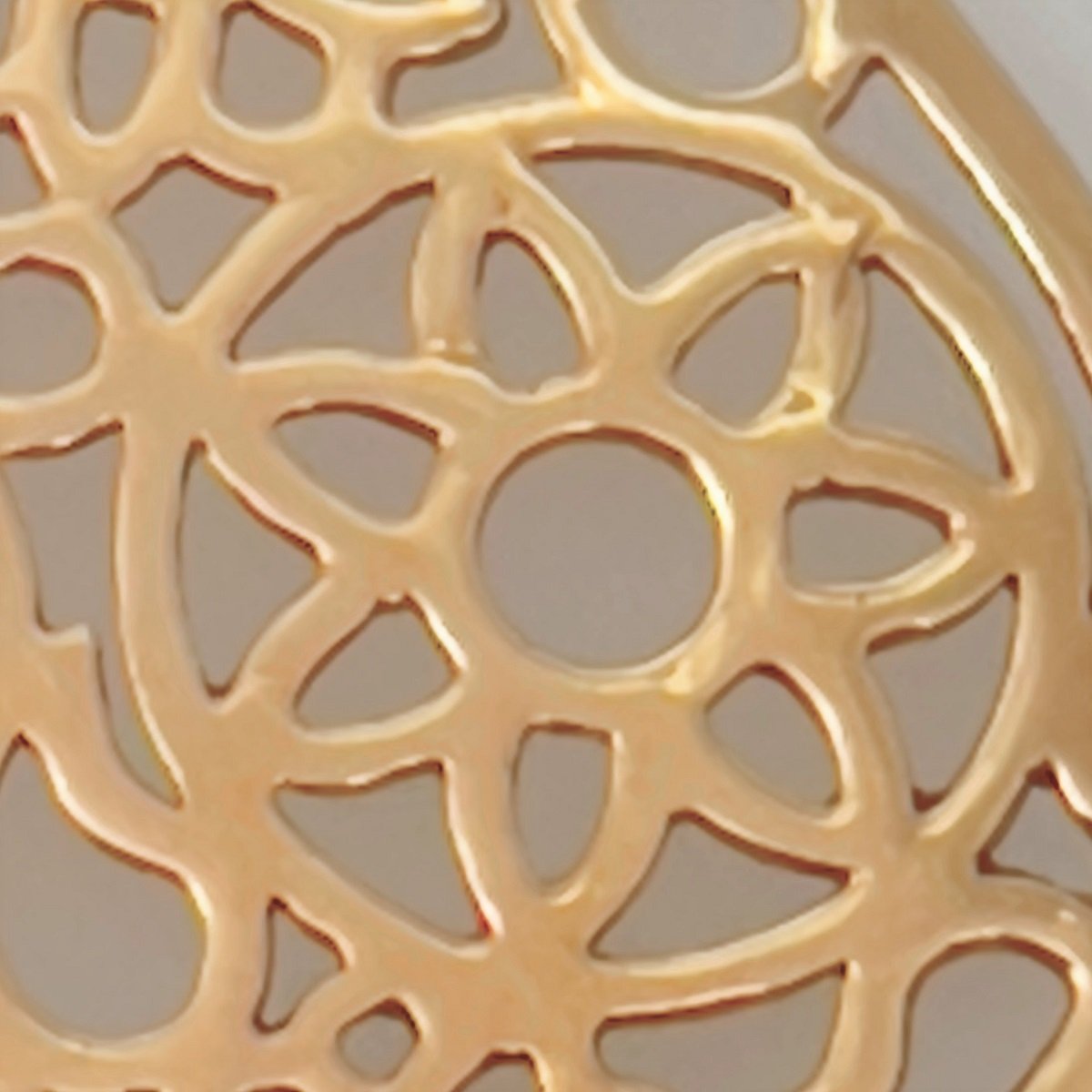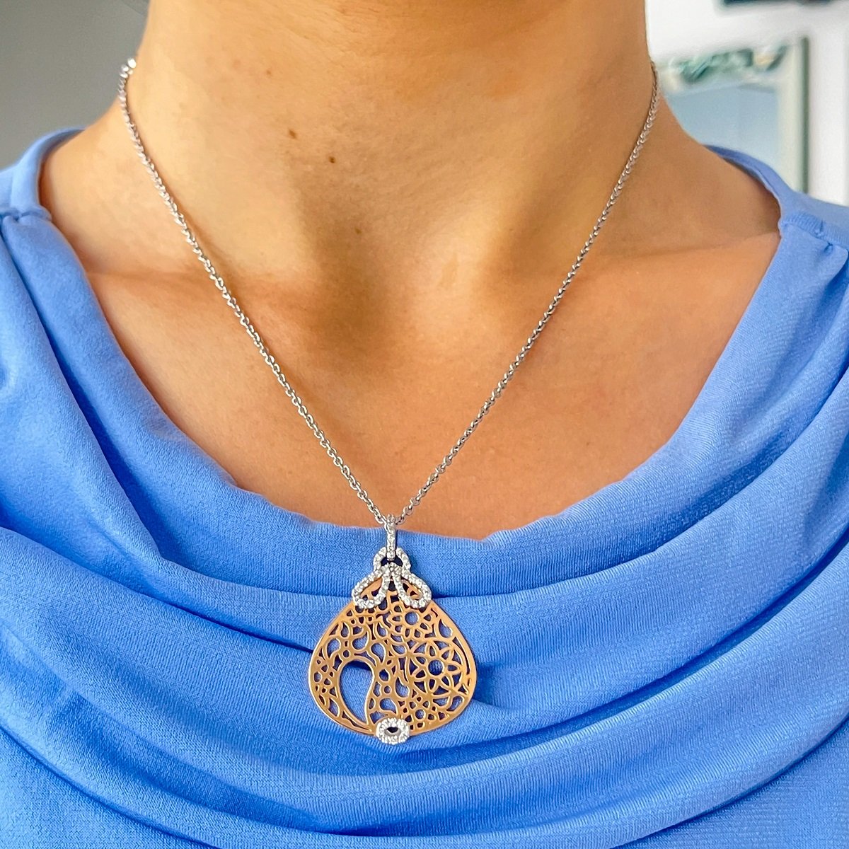Open geometric design lets the light shine through the pendant, while diamonds sparkle atop the swirls.