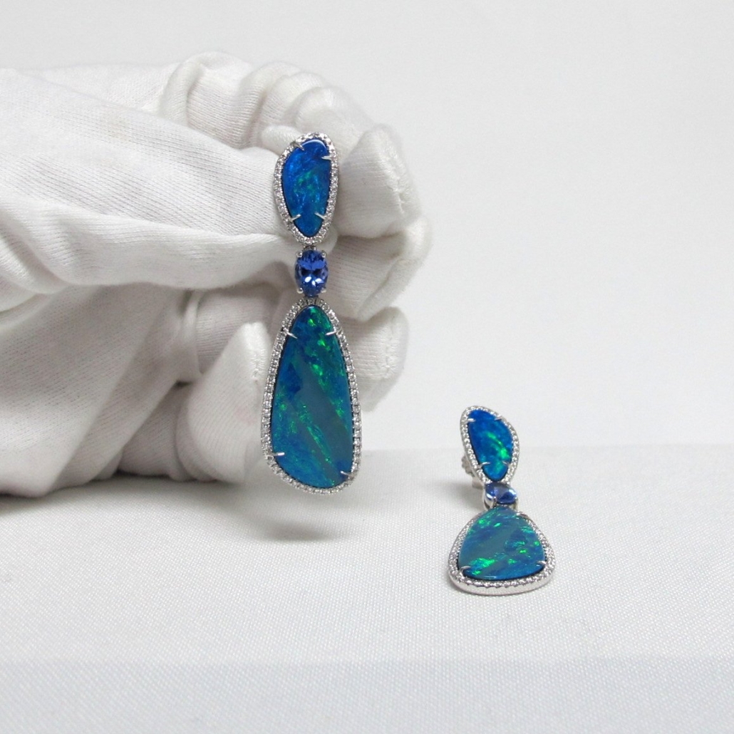 Center stones are opal doublets with tanzanite and and diamond accents.