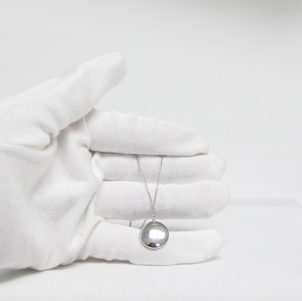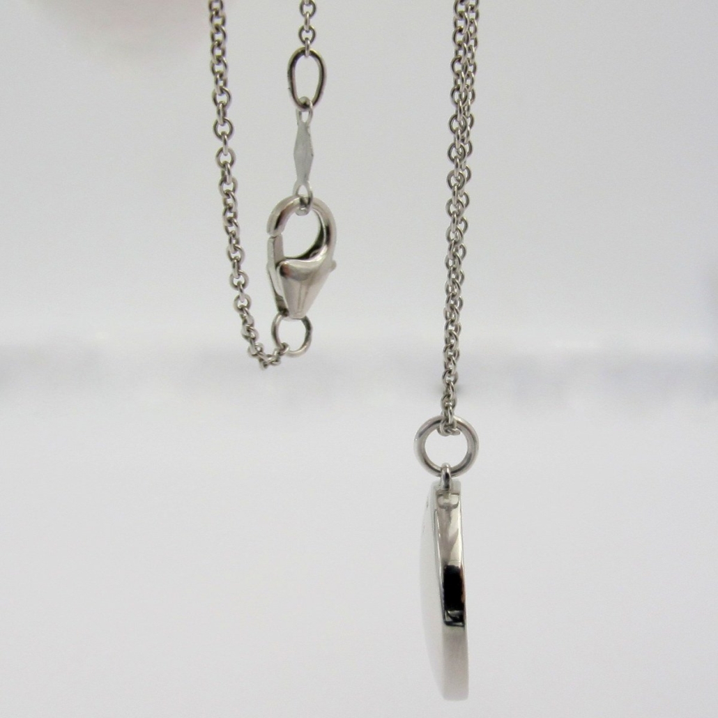 This pendant is made with 14k plumb white gold pendant is a concave circle and set with natural round brilliant diamonds.