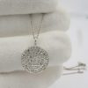 This pendant is made with 14k plumb white gold pendant is a concave circle and set with natural round brilliant diamonds.
