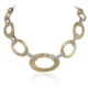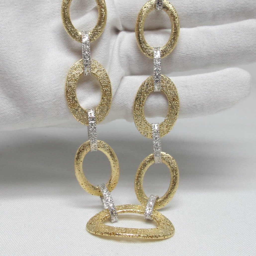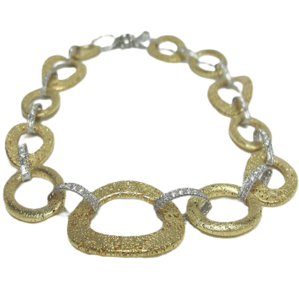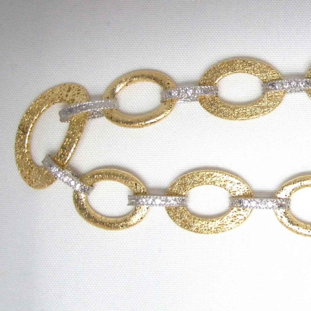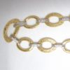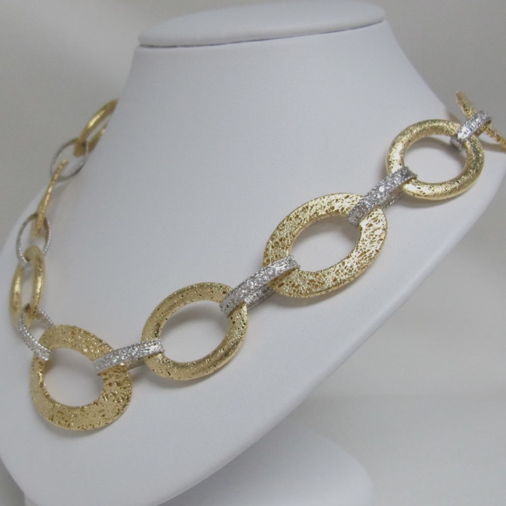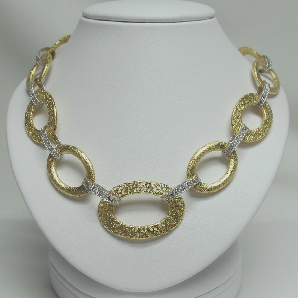 - This necklace is 18k yellow gold and weighs 55grams. It is twenty inches long. There are ten large flat links that are open and oblong shaped. They are in a birds nest design. Each link is hollow and joined together with a white gold and diamond flat ribbon link. There are 1.62 carats of natural round brilliant diamonds in the necklace.