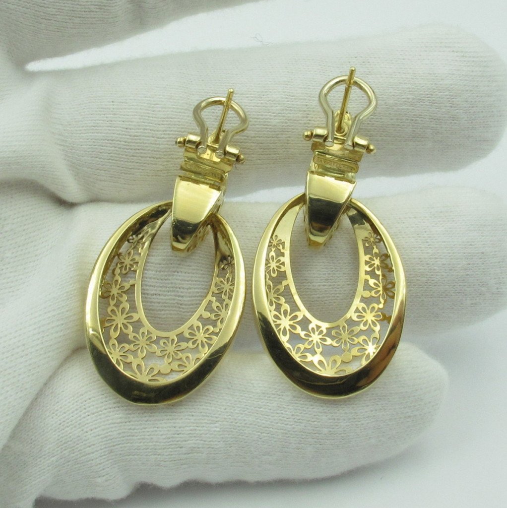 These earrings are 18k yellow gold and weigh nine grams. The earrings have fine daisy details on the front and sides. They are lightweight and comfortable, secured with lever backs.