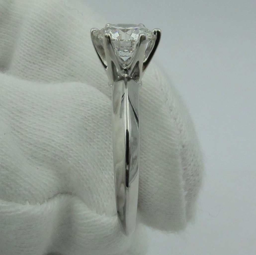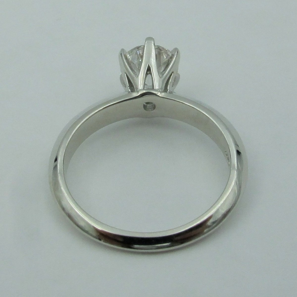 18K White Gold Solitaire Engagement Ring with a six prong set diamond crown top mounted on a knife edge shank.