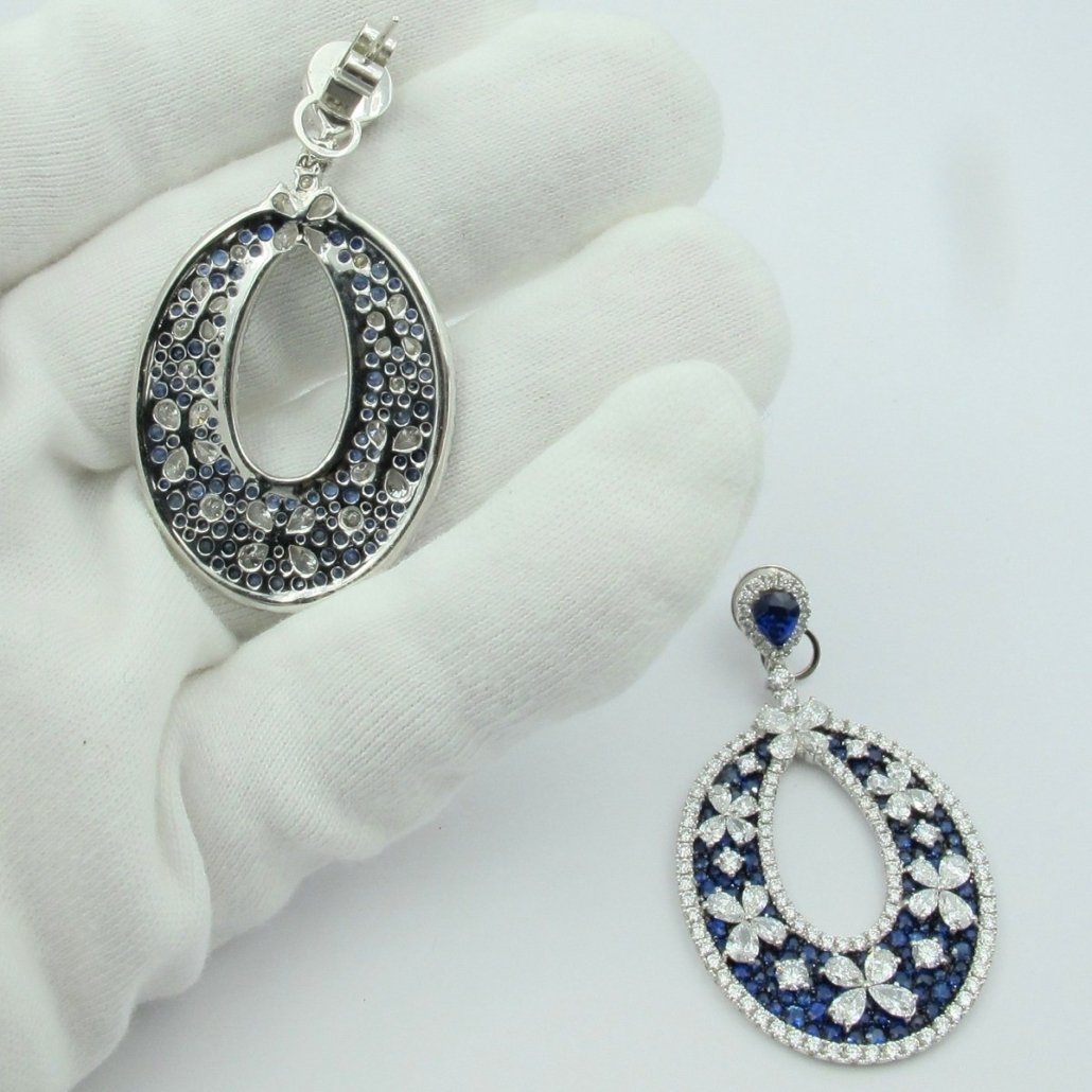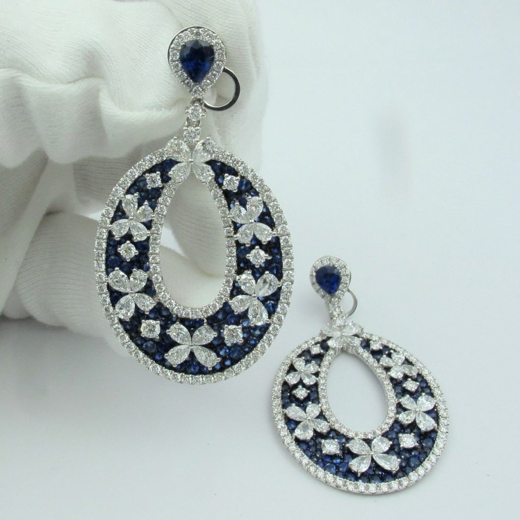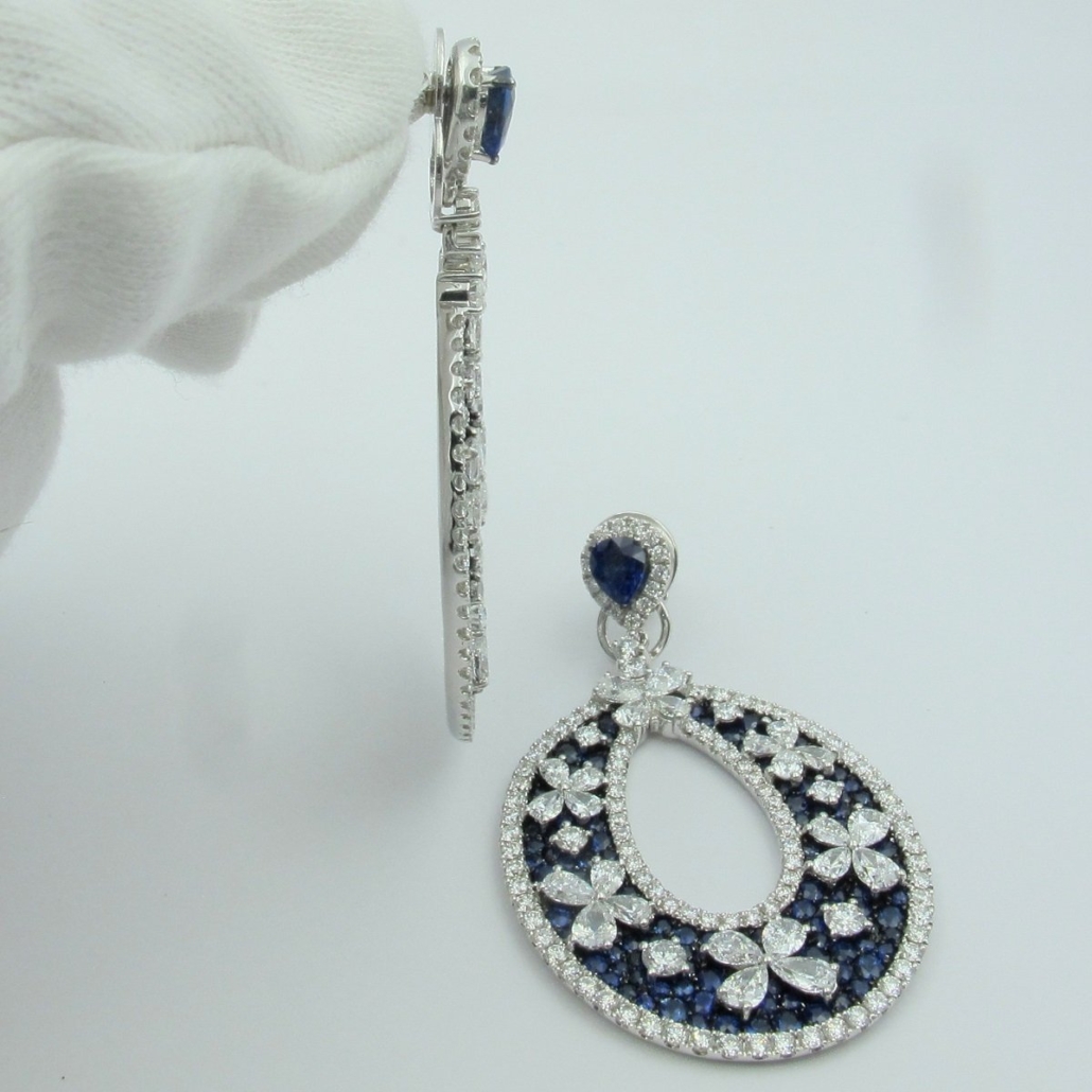 These earrings are made with 18k white gold set with cluster of sapphires and diamonds.