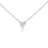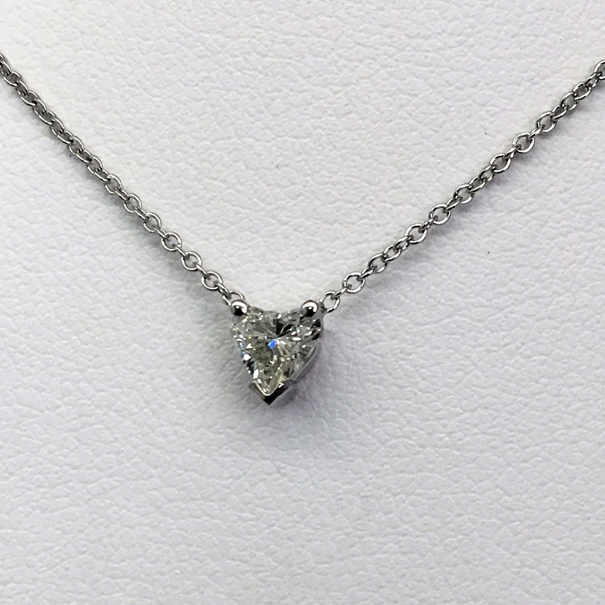 This solitaire pendant contains a beautiful heart shaped diamond that weighs .33carat. The heart shape diamond is 4mm wide and 5mm long. The color grade is G and the clarity grade is I1. The setting is an open basket with a V prong. The pendant is permanently attached to a cable link chain measuring 16” long. The necklace is secured with a lobster clasp.