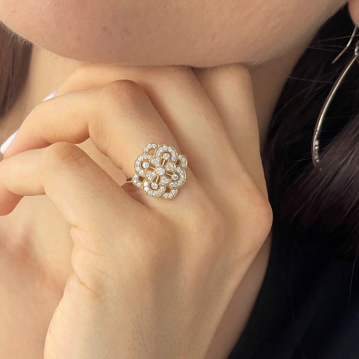 This yellow gold and diamond floral ring is part-antique, part-statement, and 100% style! Made with 14k yellow gold