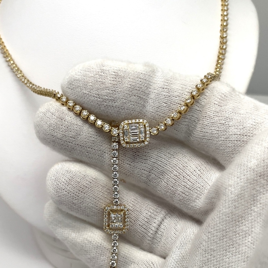 This necklace is made with 18k yellow gold. Each link is a four prong set round brilliant diamond . The center of the necklace is a baquette crown – a cluster of diamonds made with small baguette cut diamonds surrounded by small round brilliant cut diamonds.