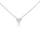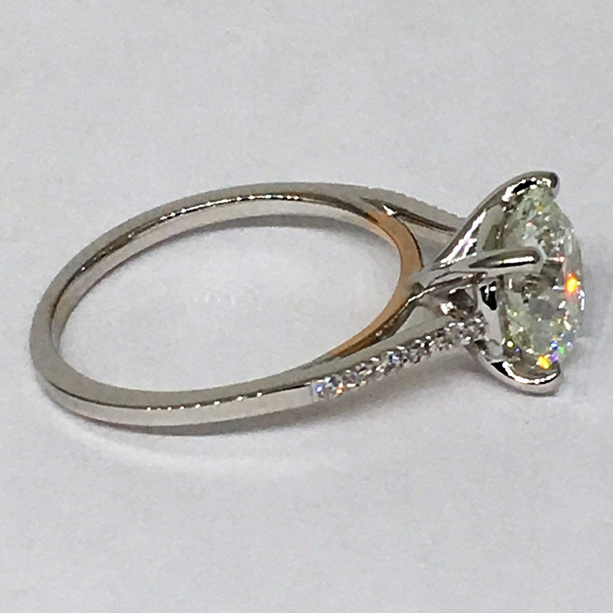 weight of .07carats. The ring design is a cathedral setting with a four prong basket head. The ring is made of 14k white gold and there is a rose gold bridge