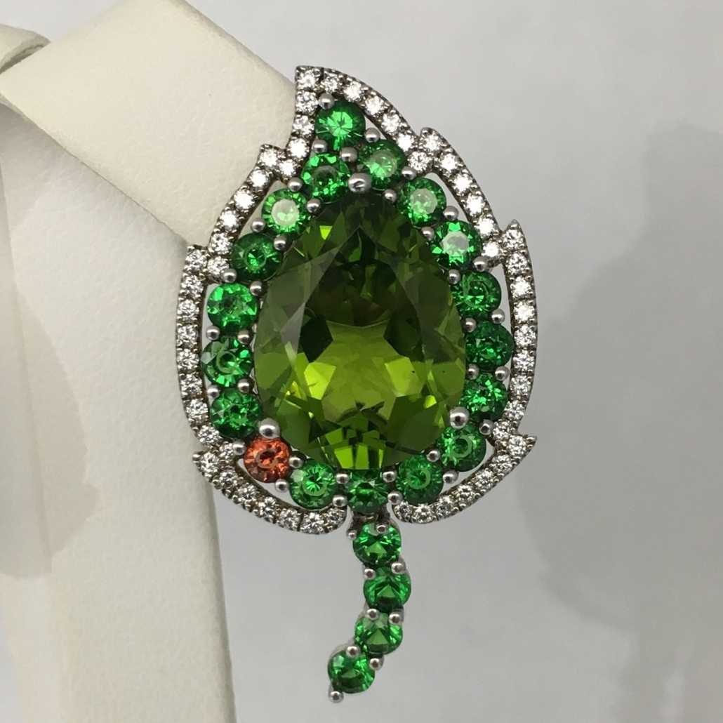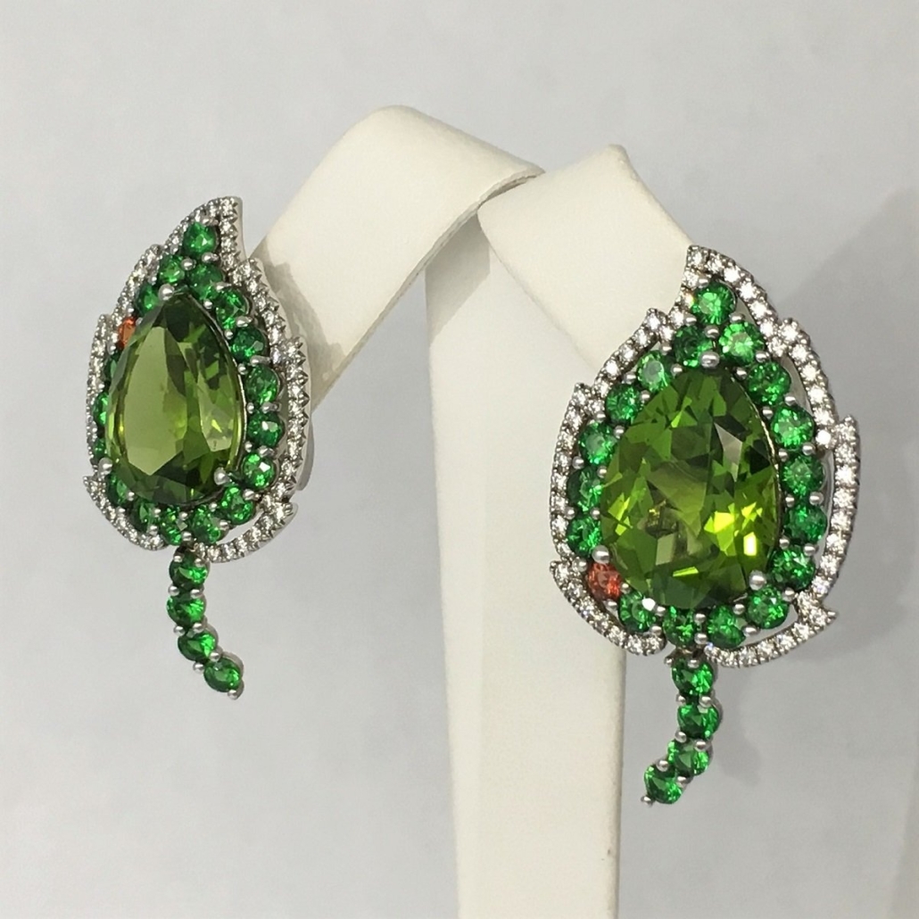 These magnificent earrings are made with naturally mined gems of green peridot and tsavorite, orange garnets, and diamonds—all in their natural colors and their natural clarity, set in 18k white gold to create a leaf design.