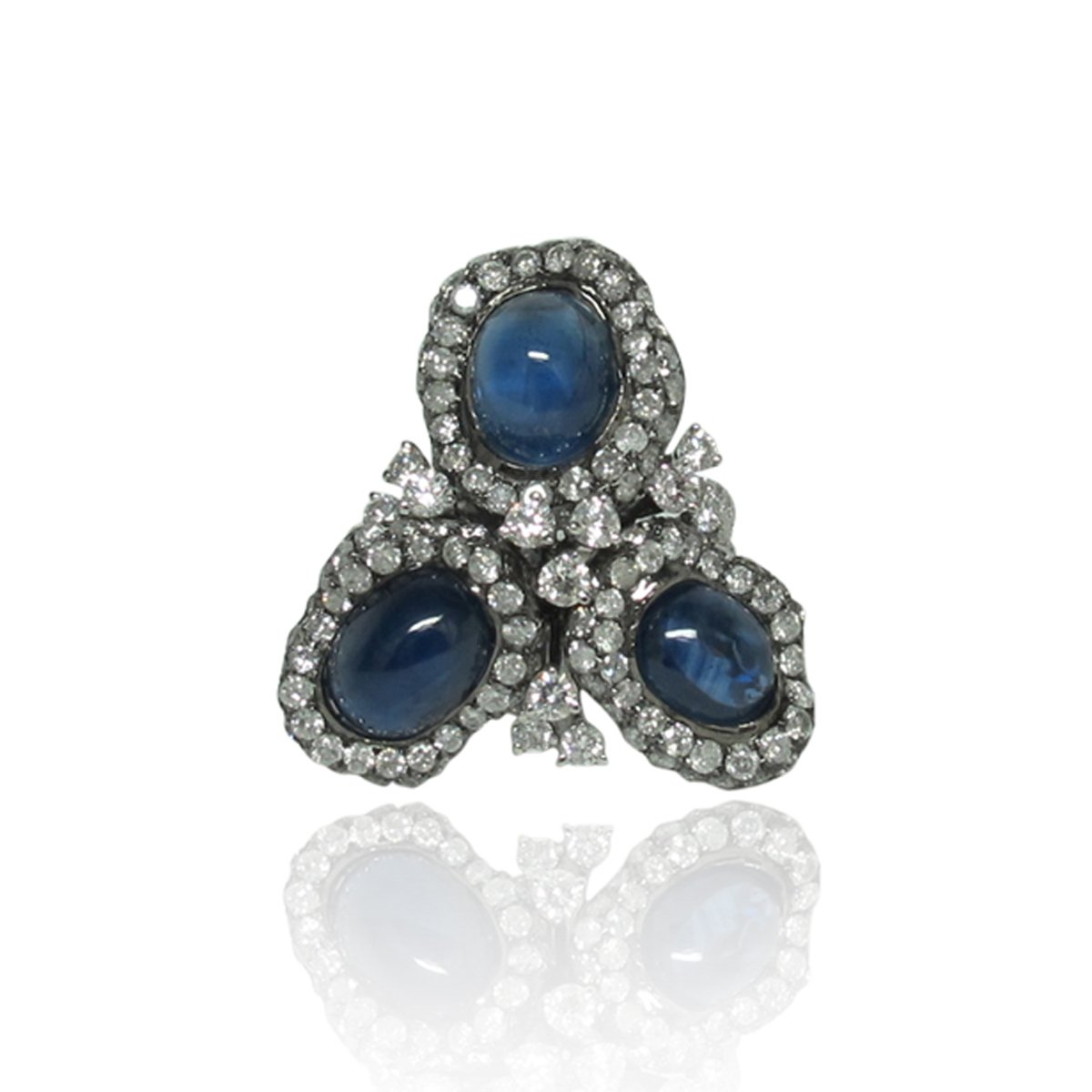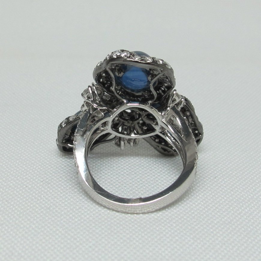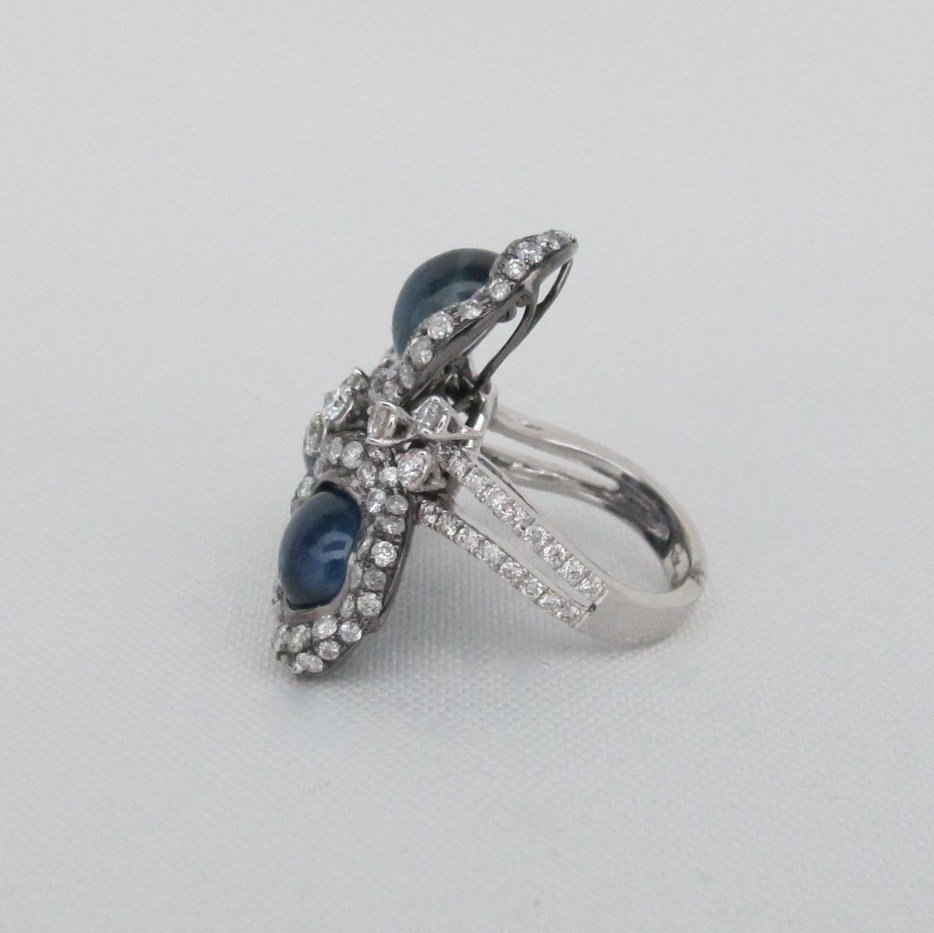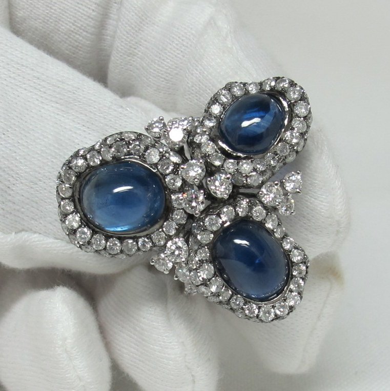 This ring is 18k white gold and weighs 13.50 grams. It contains three large natural oval cabachon blue sapphires and 3.76 carats of natural diamonds.