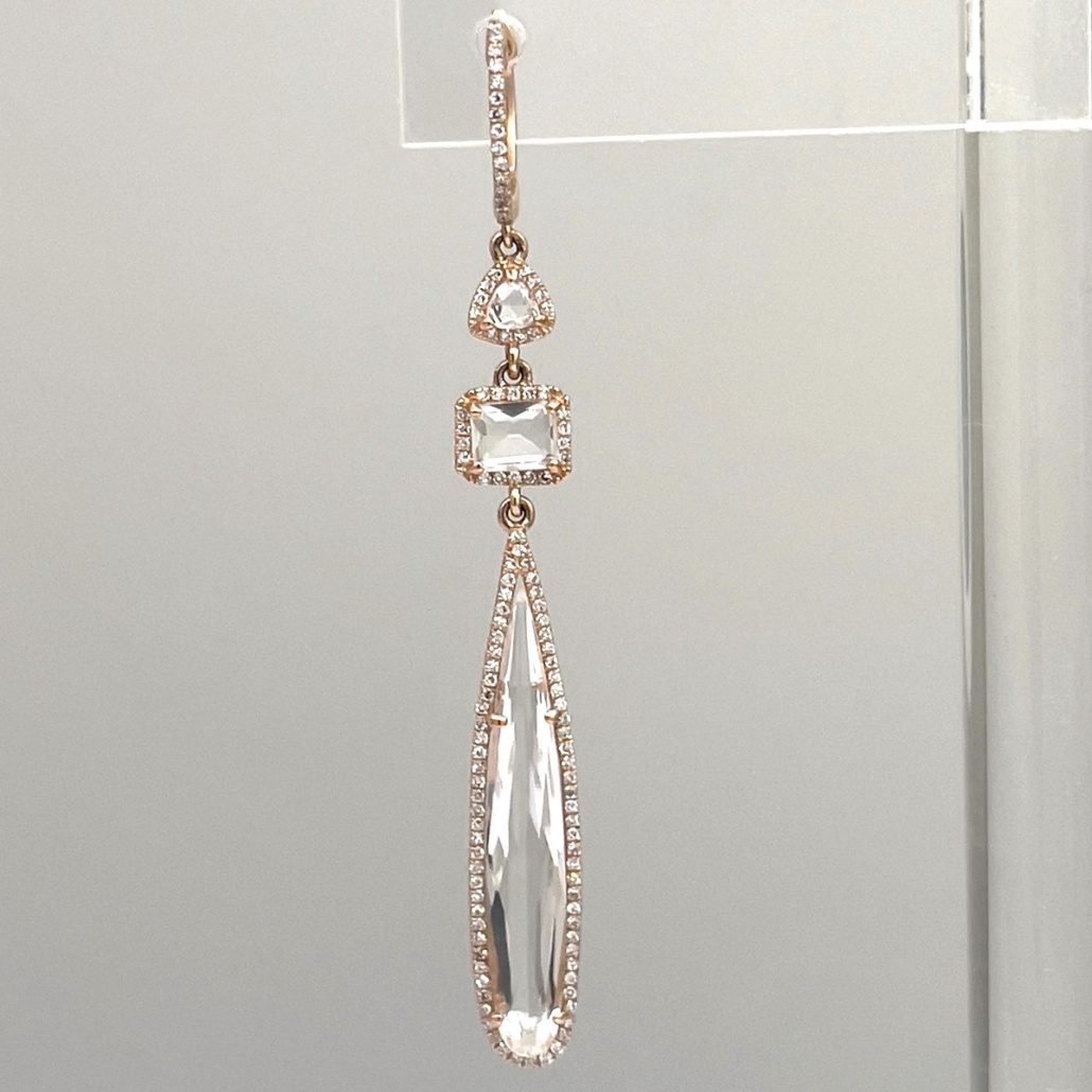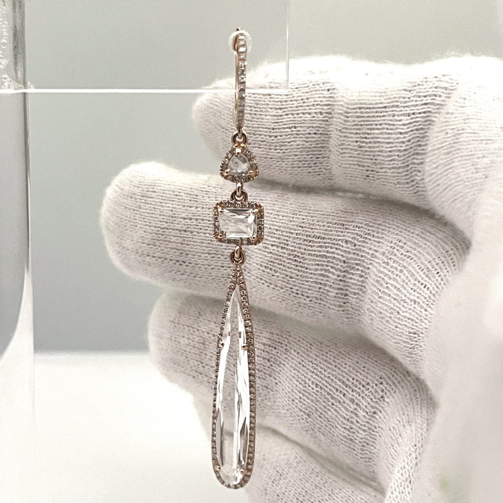This dangle hoop earrings are made with 14k rose gold, prong set with white topaz stones that are surrounded by round brilliant diamonds.