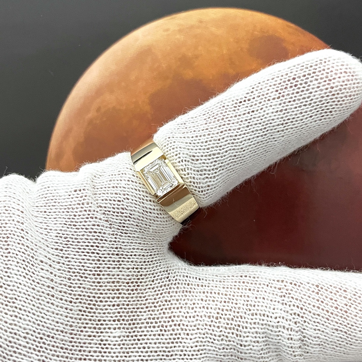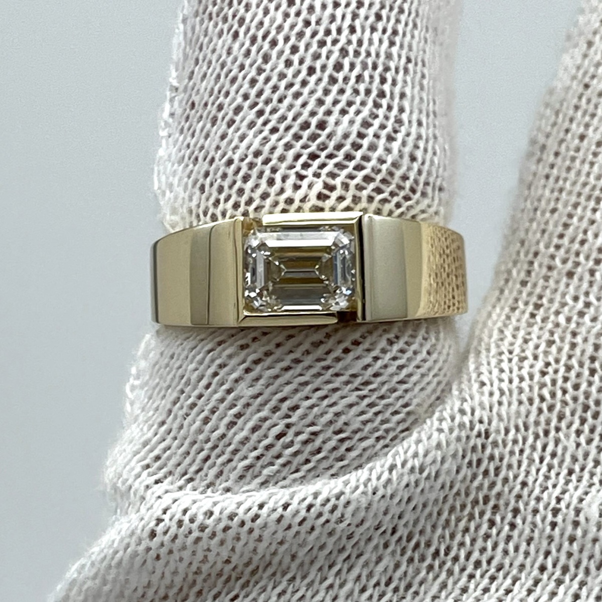A statement of confidence and clarity, this ring features a striking emerald-cut diamond embraced by a sleek, geometric bezel in polished yellow gold.