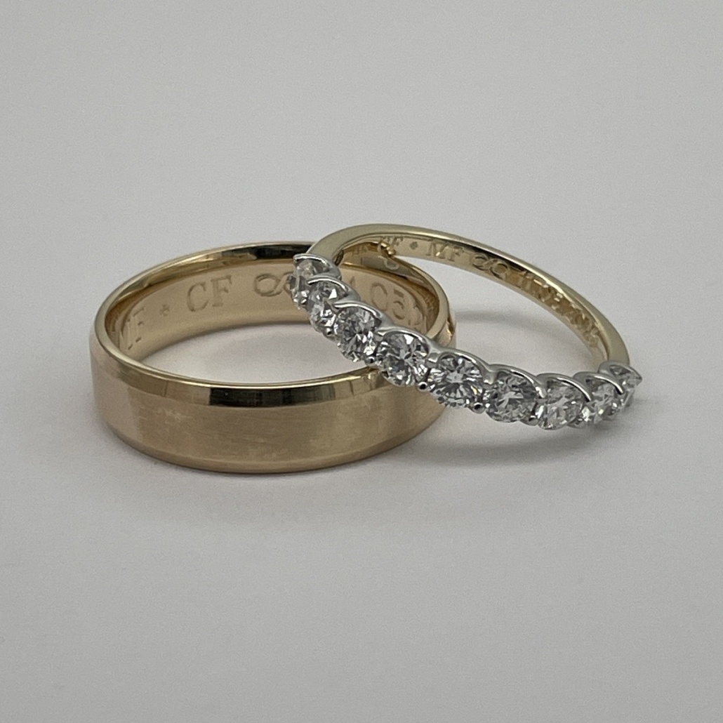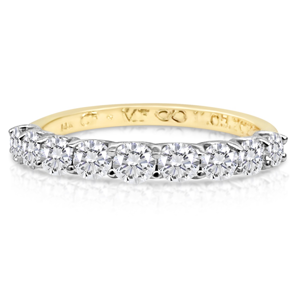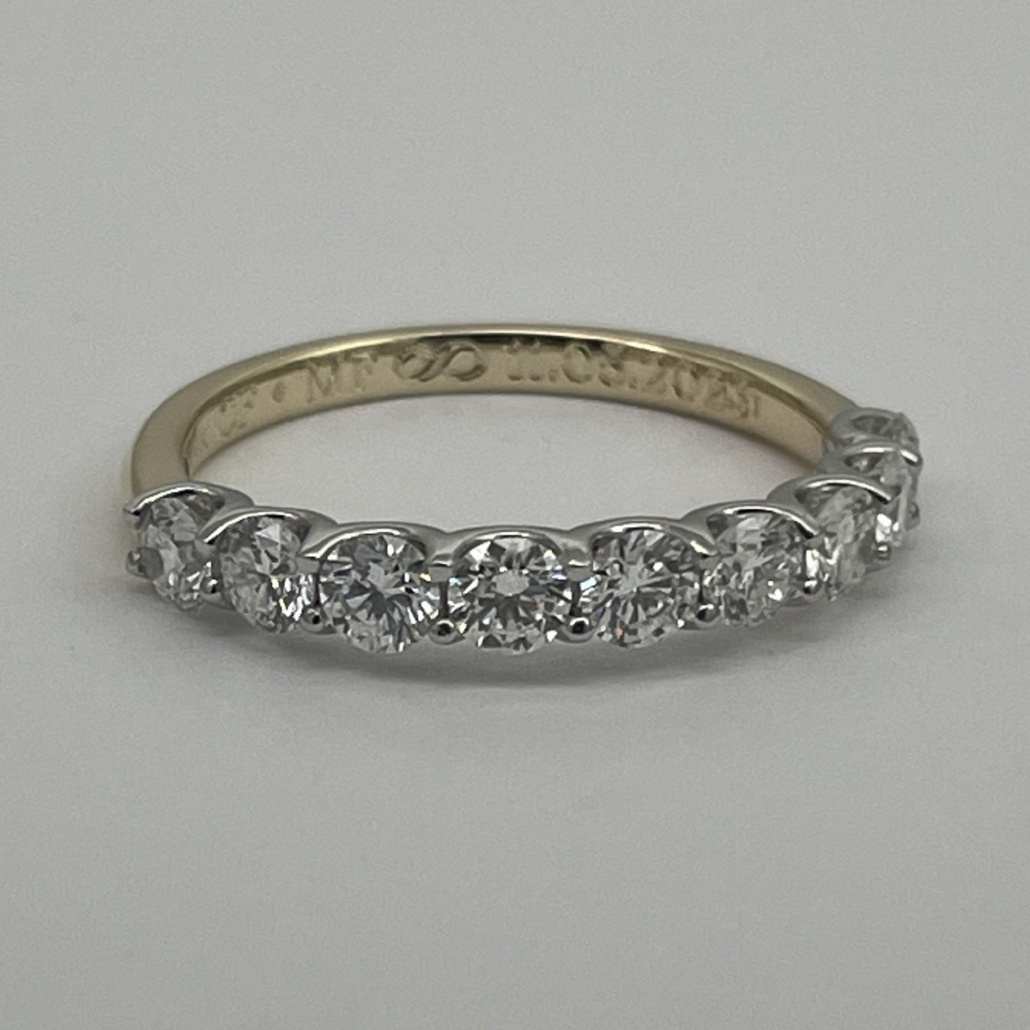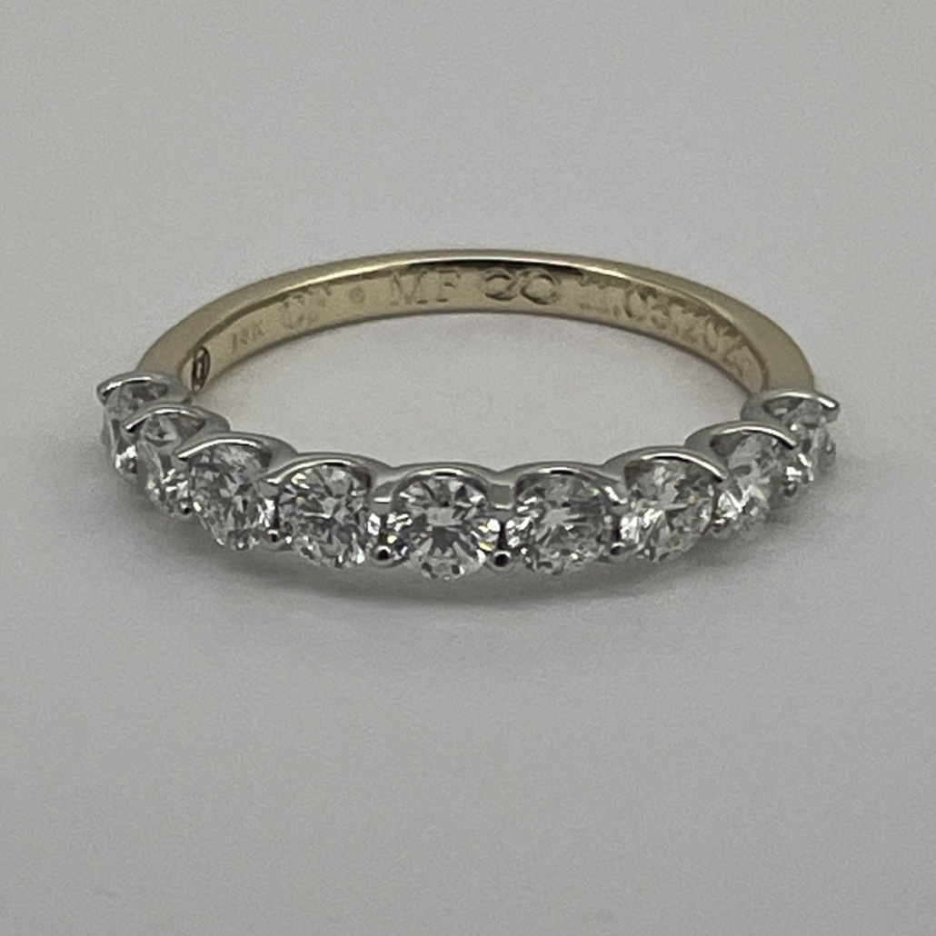 This wedding band is made with natural round brilliant diamonds prong set on platinum. And the shank made of 14k yellow gold.
