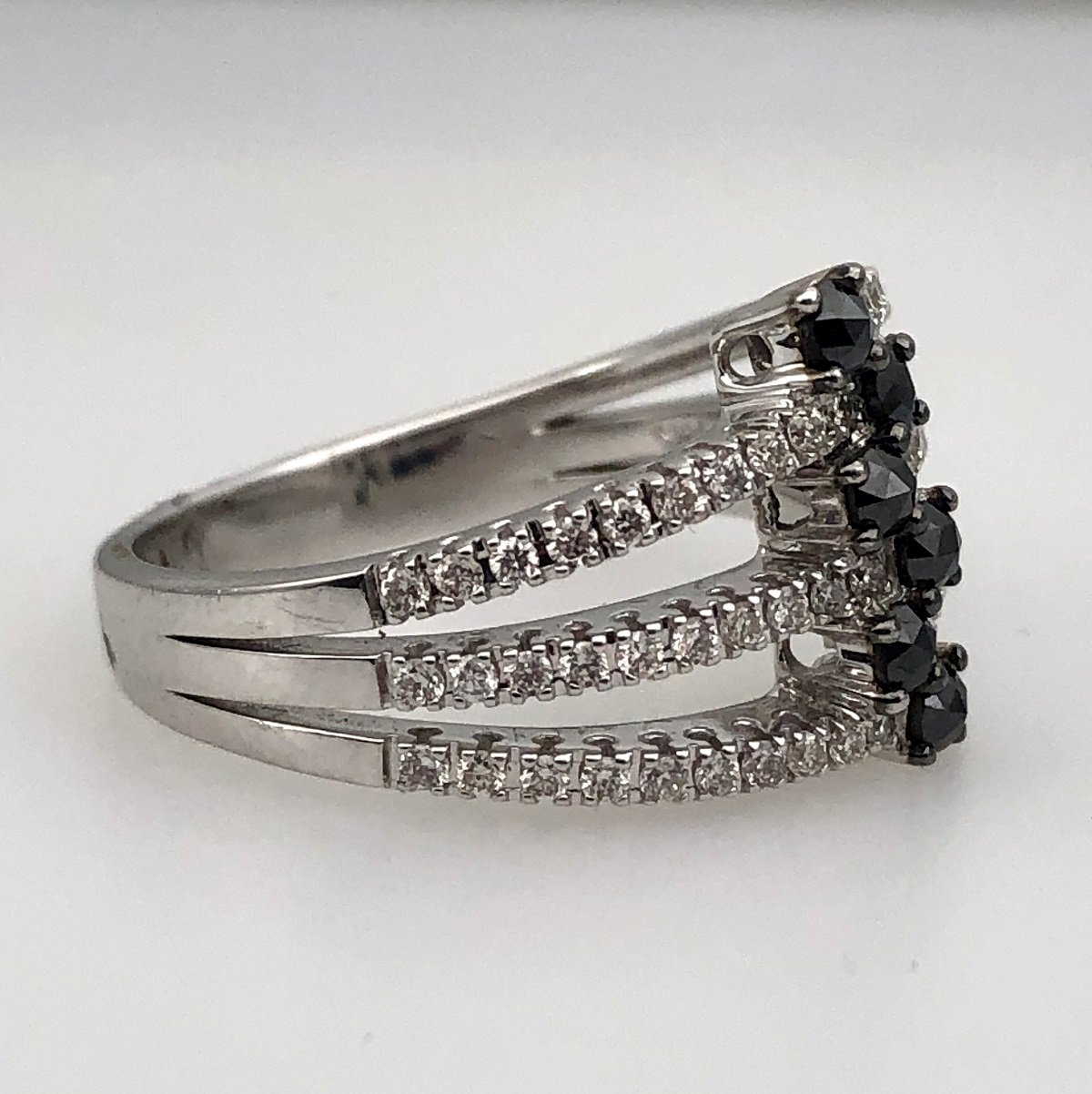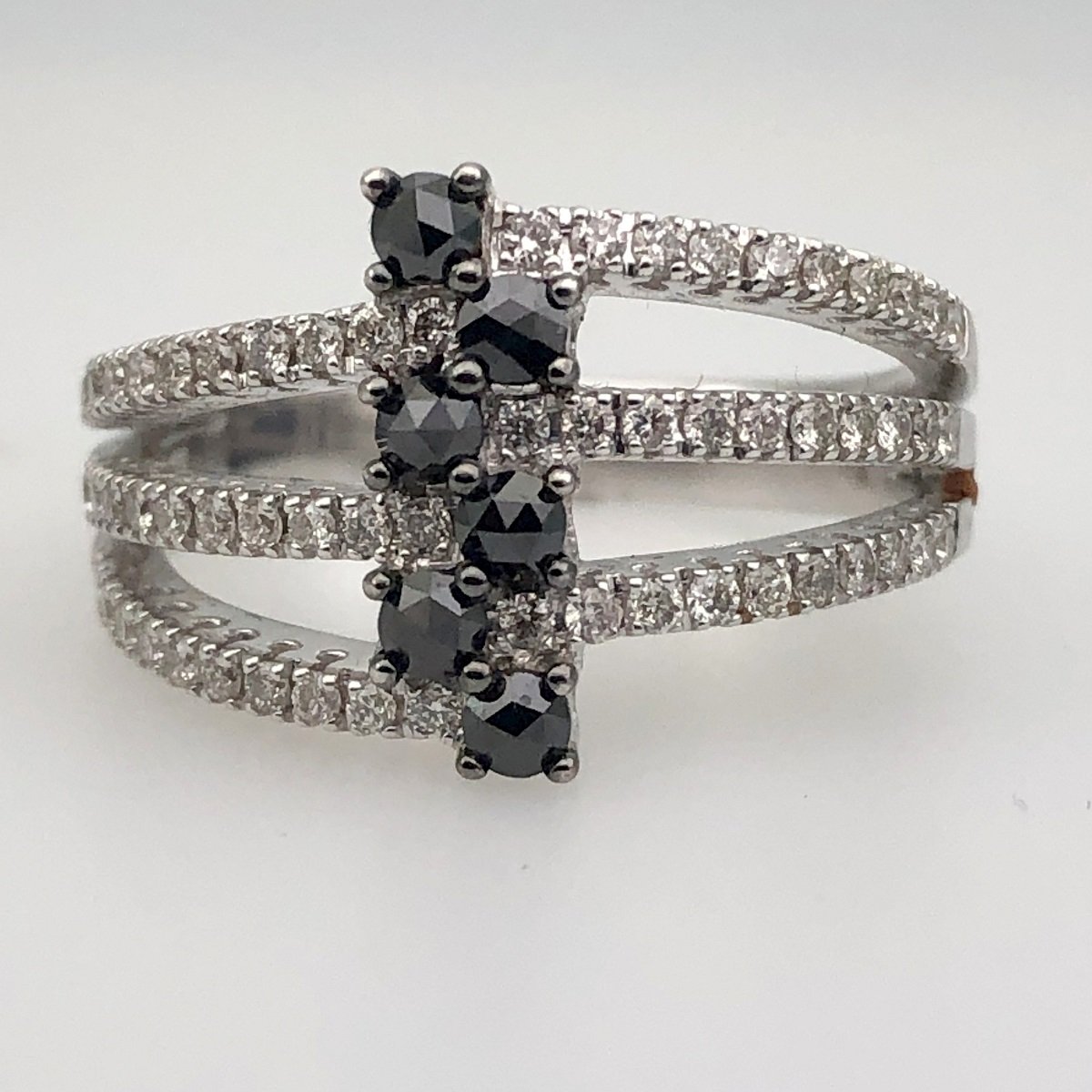 Three rows of natural mined diamonds are capped on the inside with a fancy black diamond. 66 Diamonds were used to create this contemporary design!