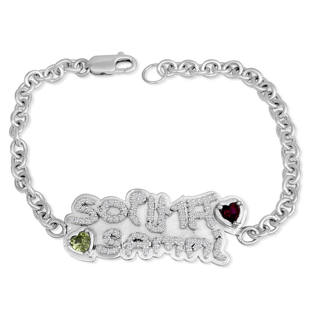 This beautiful and heartwarming bracelet is made with 14k white gold and natural round brilliant diamonds. Next to the children names their birthstones, garnet and peridot. The birthstones are bezel set heartshapes.
