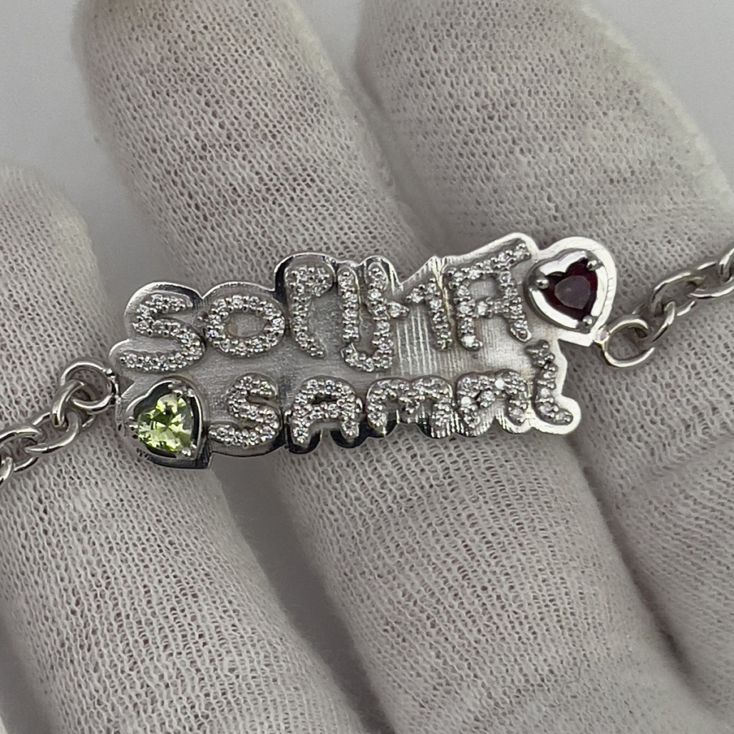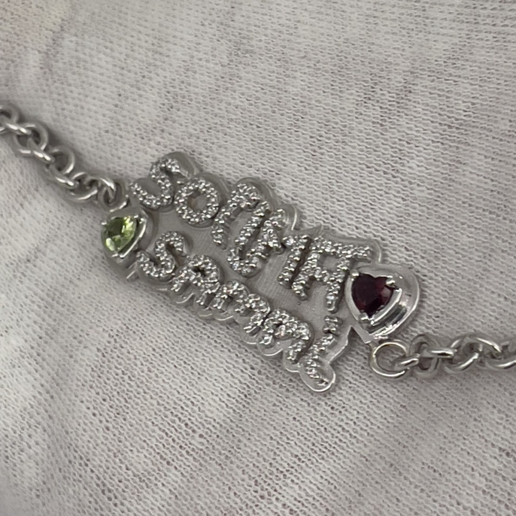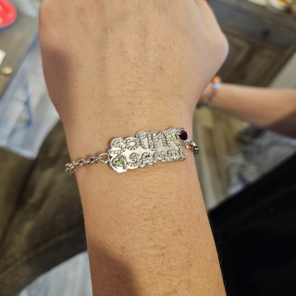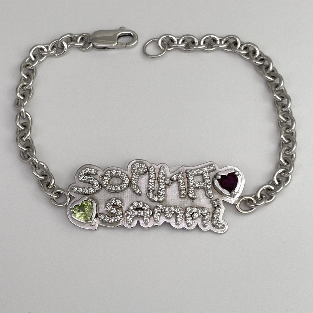 Capturing the innocent grace of childhood. This bracelet is intricately designed with the authentic handwriting of children writing their names for the first time. Contact Susan now and turn your cherished memories into wearable art.