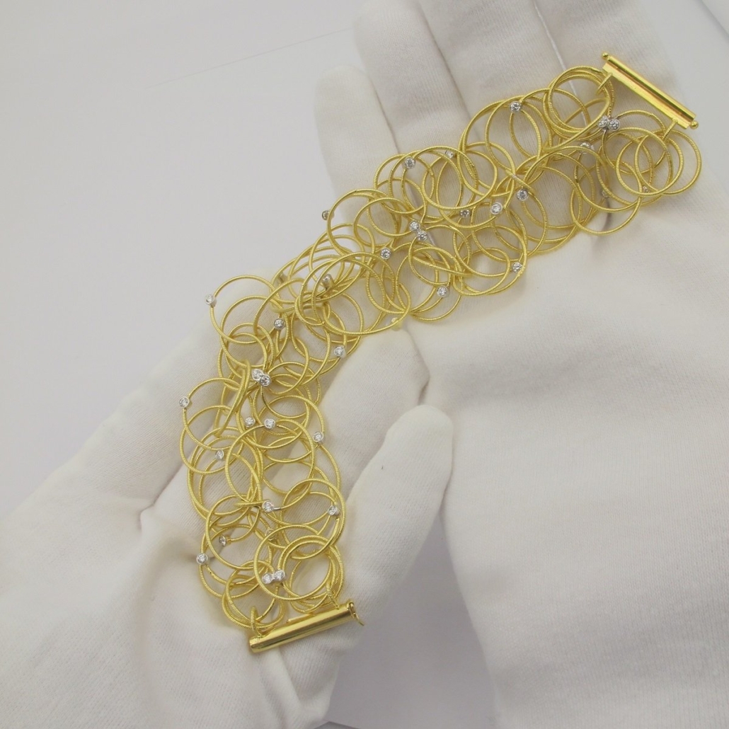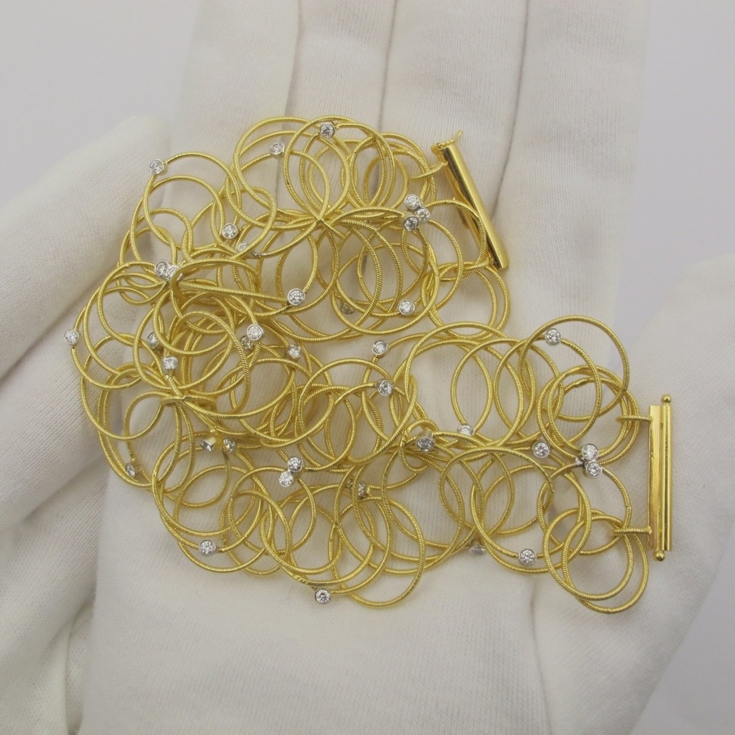 This 18k yellow gold multi-circle design features links that appear to be wrapped in fine gold thread and bezel set natural round brilliant diamonds. There is a silky texture to the design. Hand-made in Italy!