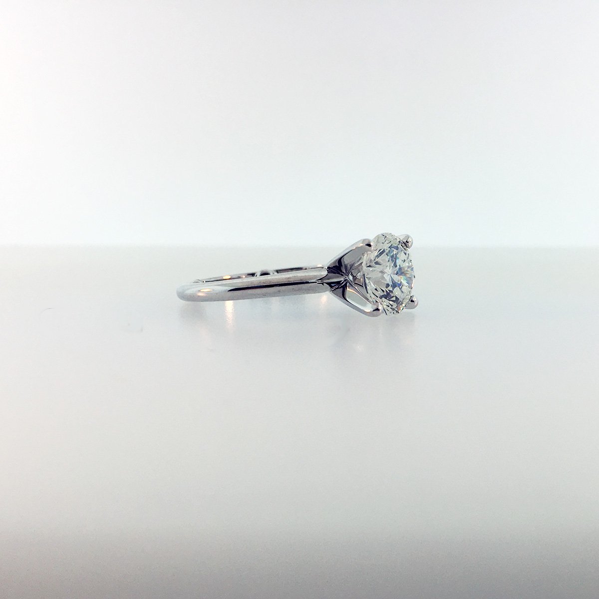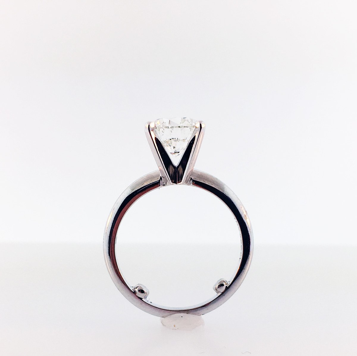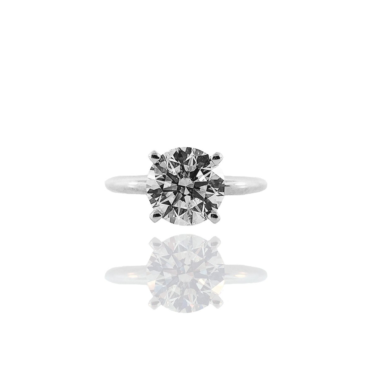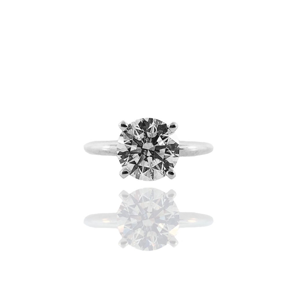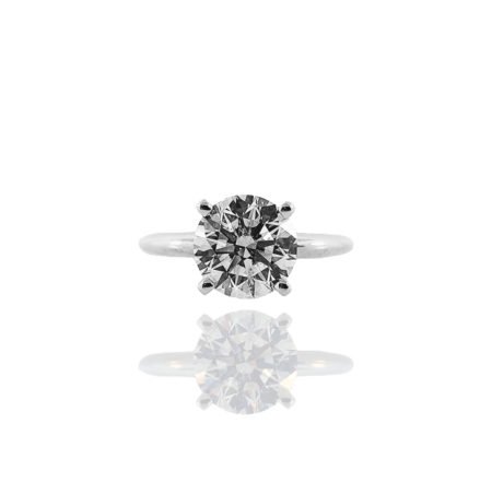 This engagement ring is 95% platinum, 5% iridium and weighs 5.75 grams. The ring design is a 4 prong knife edge solitaire. The ring is holding a natural round brilliant diamond that weighs 2.33 carats. The diamond is GIA certified and has a color grade of I and a clarity grade of SI2. The cut, polish and symmetry are excellent.