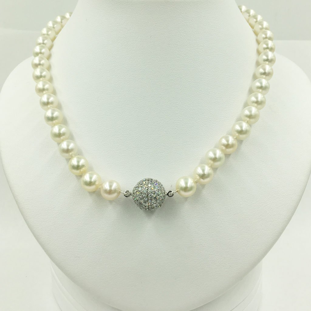 Akoya cultured pearl choker with diamond ball clasp. Simple yet fancy.