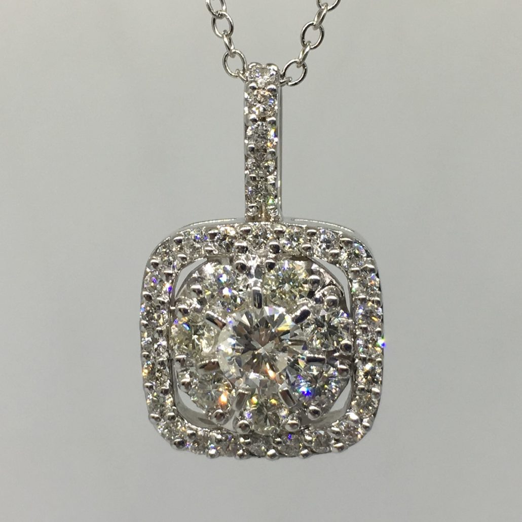 This diamond pendant has a cluster of round diamonds set inside square diamond frame. There are thirty seven natural round brilliant diamonds that have a combined total weight of 1.50 carats. The diamonds are H color and I1 clarity. They are prong set in a circle design and in a square design.