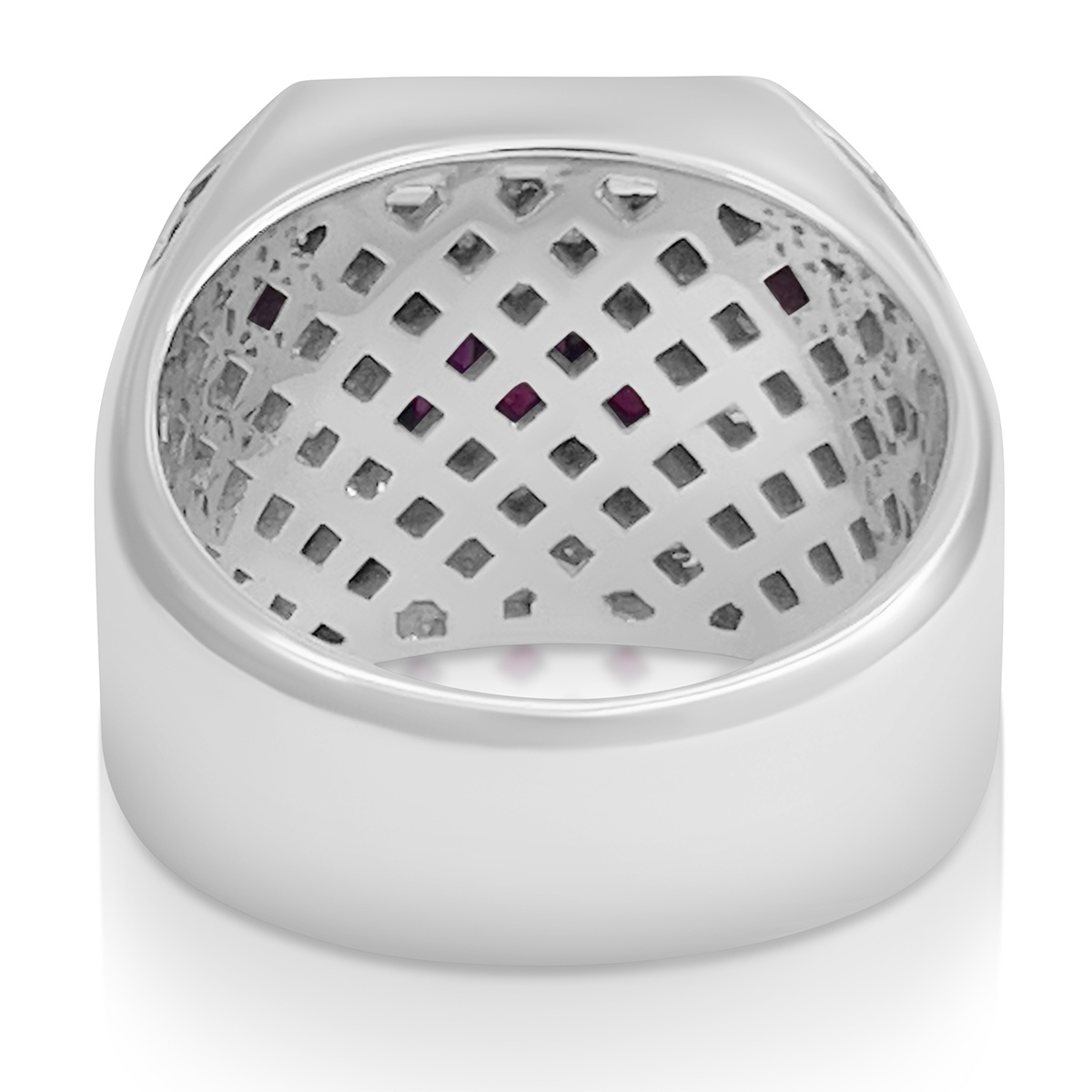 This handsome ring is made with 14k white gold and burnished set with diamonds and rubies.